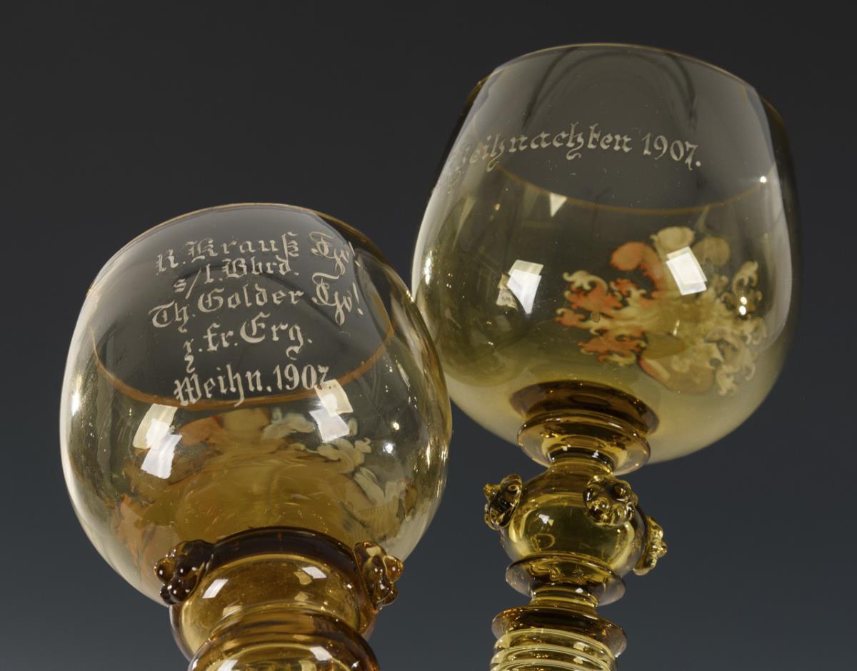 Brownish glass, polychrome enamel painting, gold staffage. H 15,5 and 16 cm.