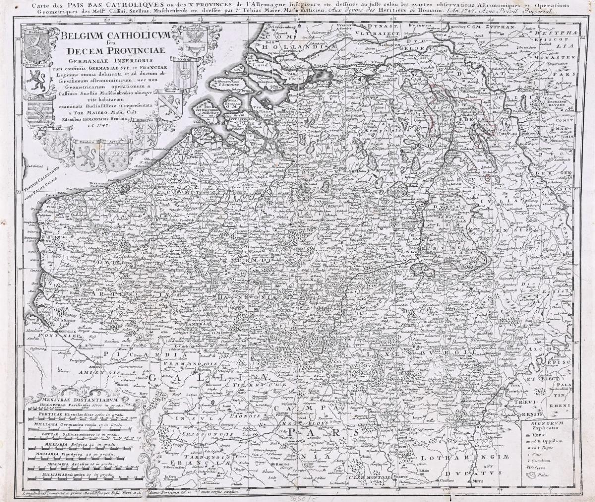 Historical map of Belgium and Luxembourg, title cartouche with arms of the 10 associated provinces "Brabant, Limburg, Luxembourg, Guelders, Flanders, Artois, Hainaut, Namur, Mechelen and Antwerp", inscribed "Belgivm Catholicvm feu Decem Provinciae Germaniae Inferioris [....]", after a map by Tobias Mayer (1723 Marbach - 1762 Göttingen). Backglued centerfold, grip-marked, some foxing and staining.