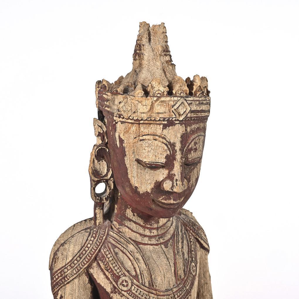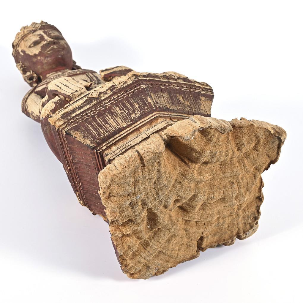 More weathered figure of a seated Buddha with the gesture of touching the earth. The hands disproportionately large. Remnants of dark red colored paint. In the rear plinth empty reliquary compartment. Larger missing parts on hand, the edge of the plinth and the crown.
