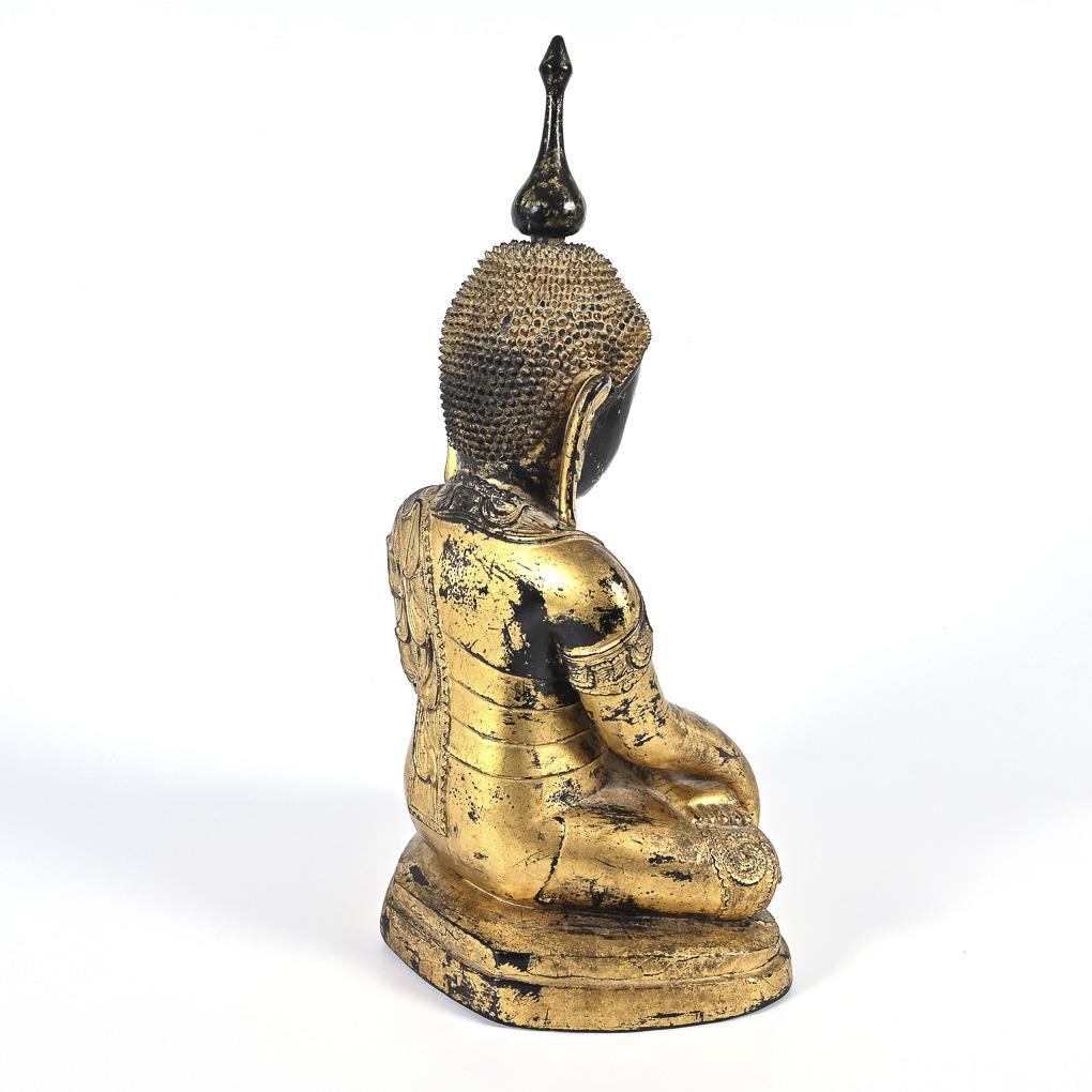 In the interlocking seat with the gesture of touching the earth. Dry crack in the base, gilding somewhat rubbed.
