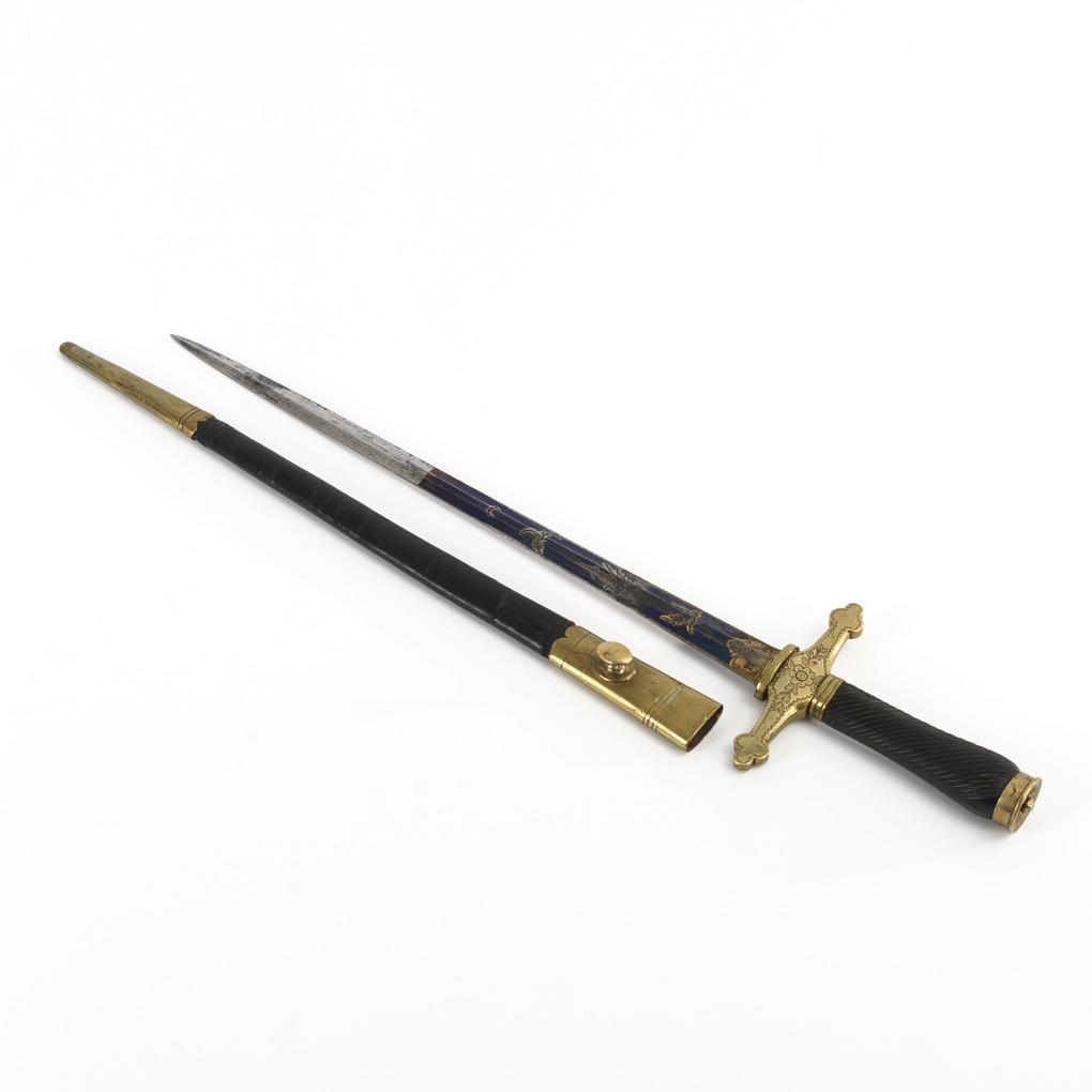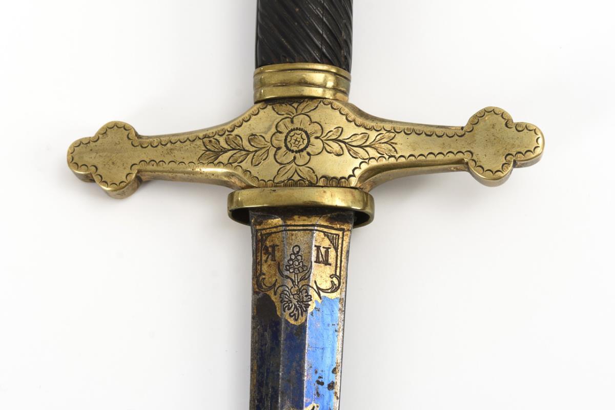 Straight, double-edged blade blued in large parts with inlaid patterns. Quillons with floral engraving. Slanted ribbed horn grip. Black leather scabbard.