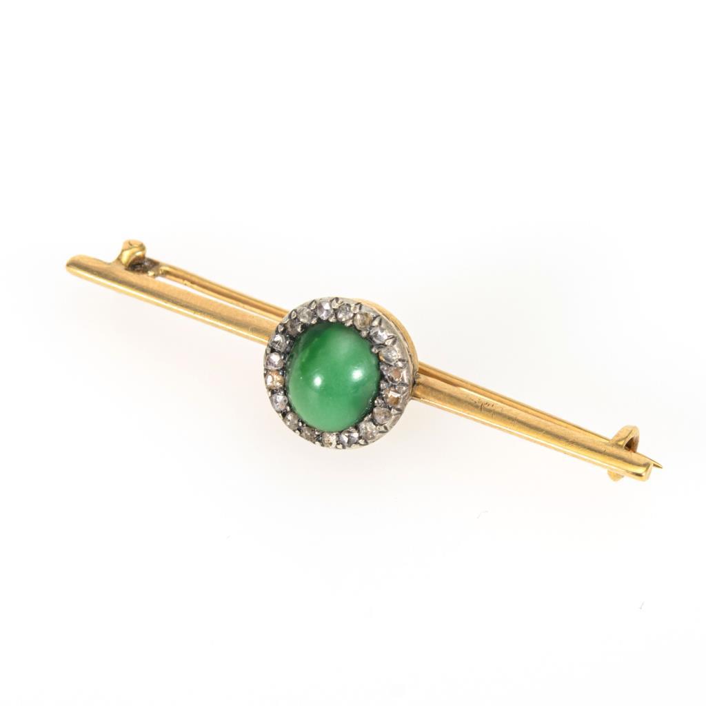 Grüner Steincabochon, umringt von kleinen Rosendiamanten. Hakenverschluss.