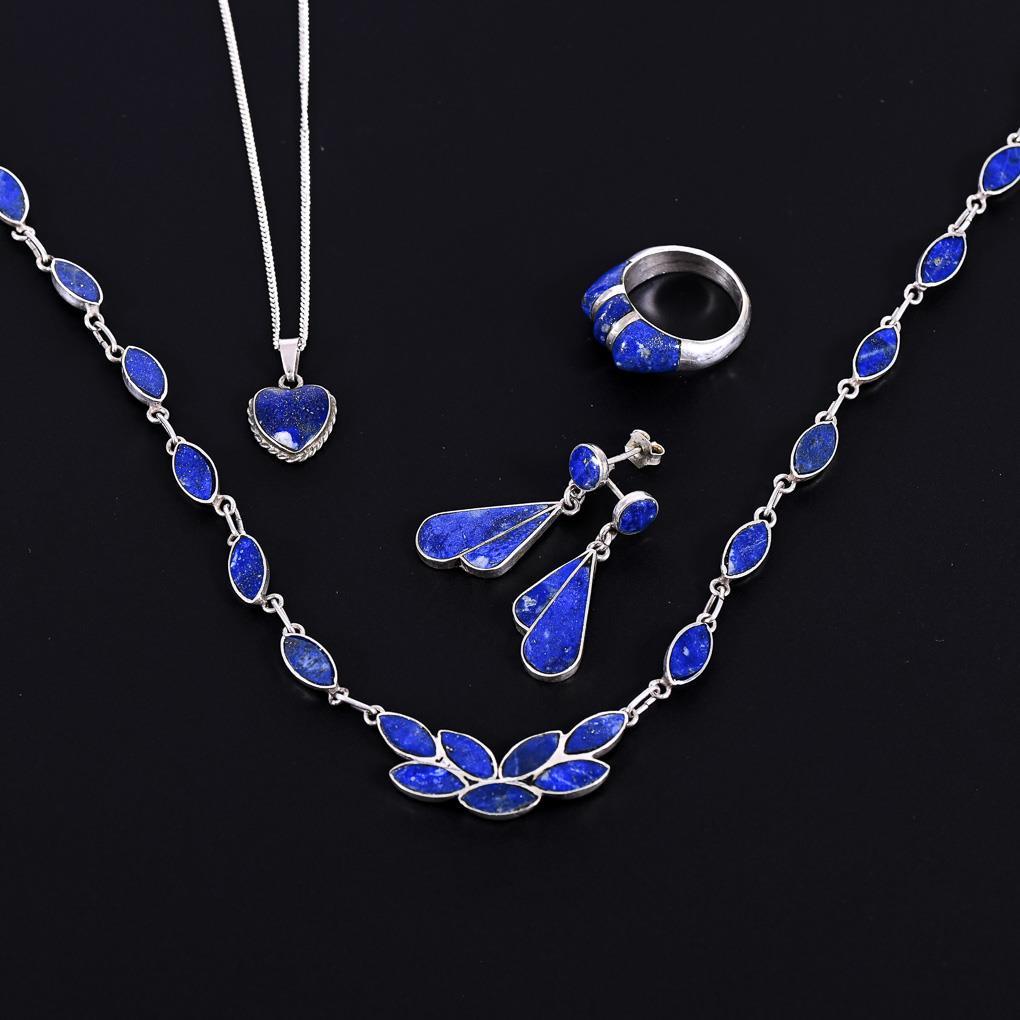 Collier, pair of earrings, ring and heart pendant on chain with bezel-set lapis inlays.