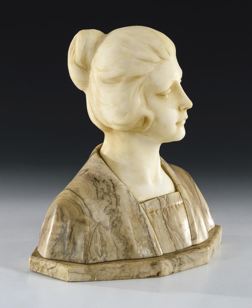 Alabaster and marble, marble plinth. Circa 1900. signed with addition "161 / I". H 24 cm, total 26 x 26 x 14 cm.