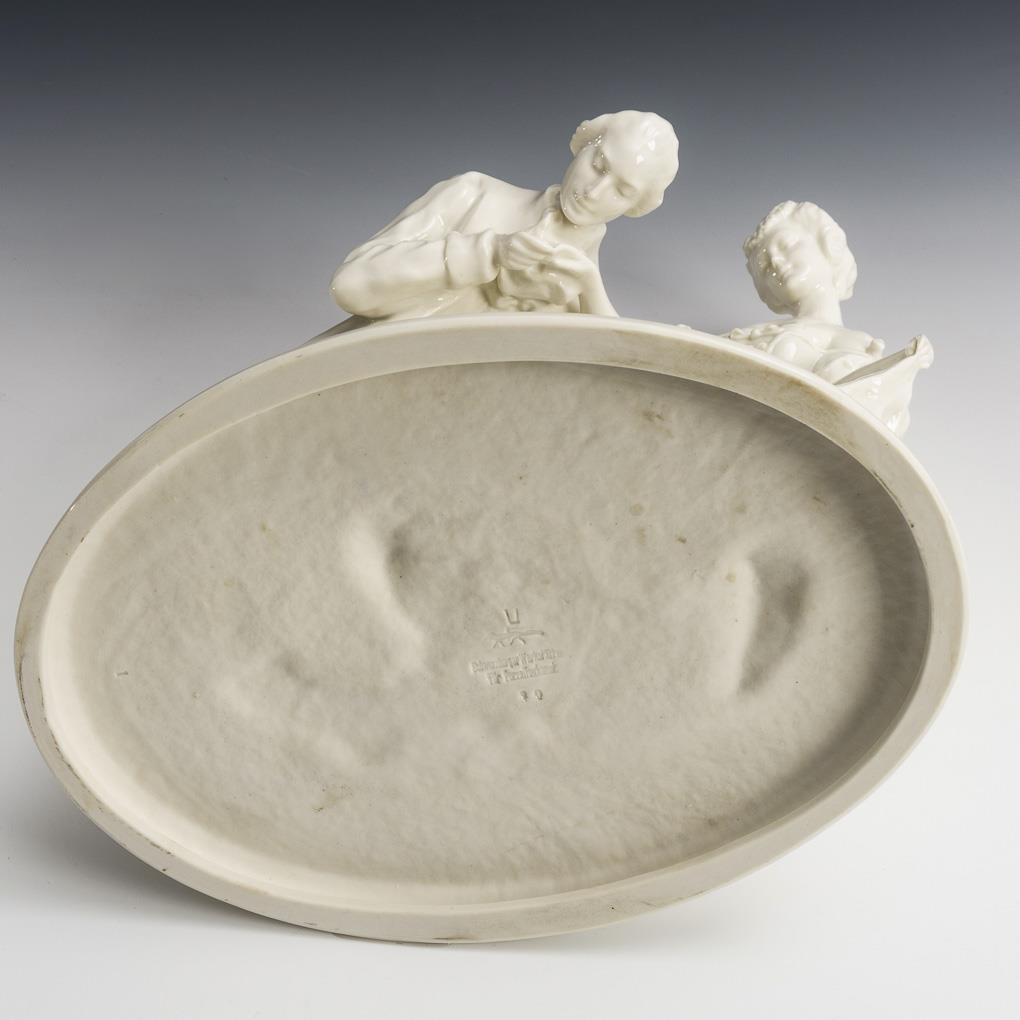 Sculpture of a rococo lady and a cavalier bowing low, kissing the lady's hand.