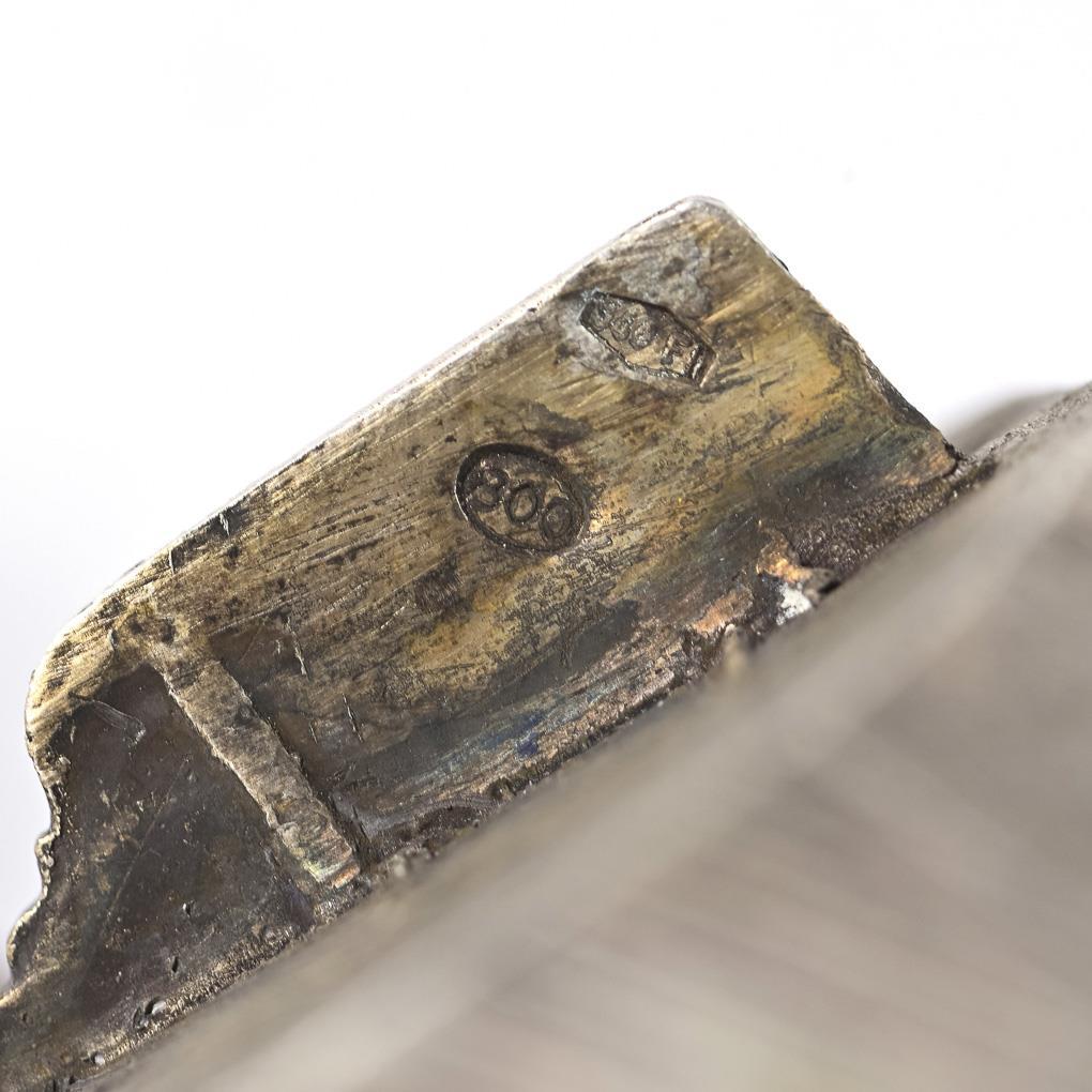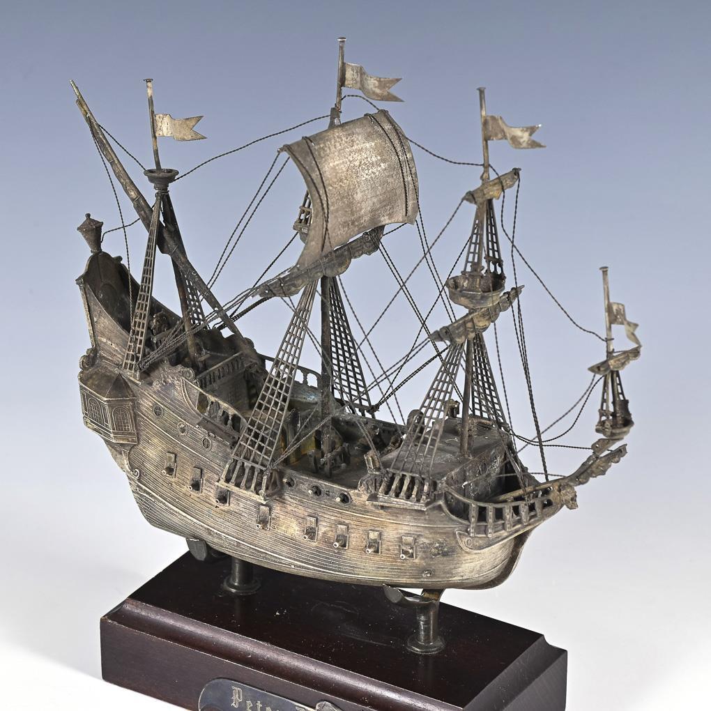 Silver sailing ship, loose on wooden base with metal plaque "Peter Pan". Slight signs of age.
