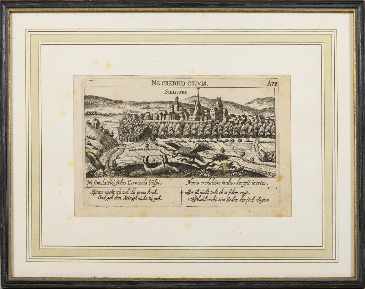 Historical town view of Schlitz "Schlitsee"; from Daniel Meisner's and Eberhard Kieser's collected works "Thesaurus philopoliticus" ("Political Treasure Box"), published between 1625 and 1631, resp. No. "A 78" from "Sciographia Cosmica" by Paulus Fürst, 1637/1638. The 8 parts were marked with the letters A to H and consecutive number after taking over the printing plates. Stick stained.