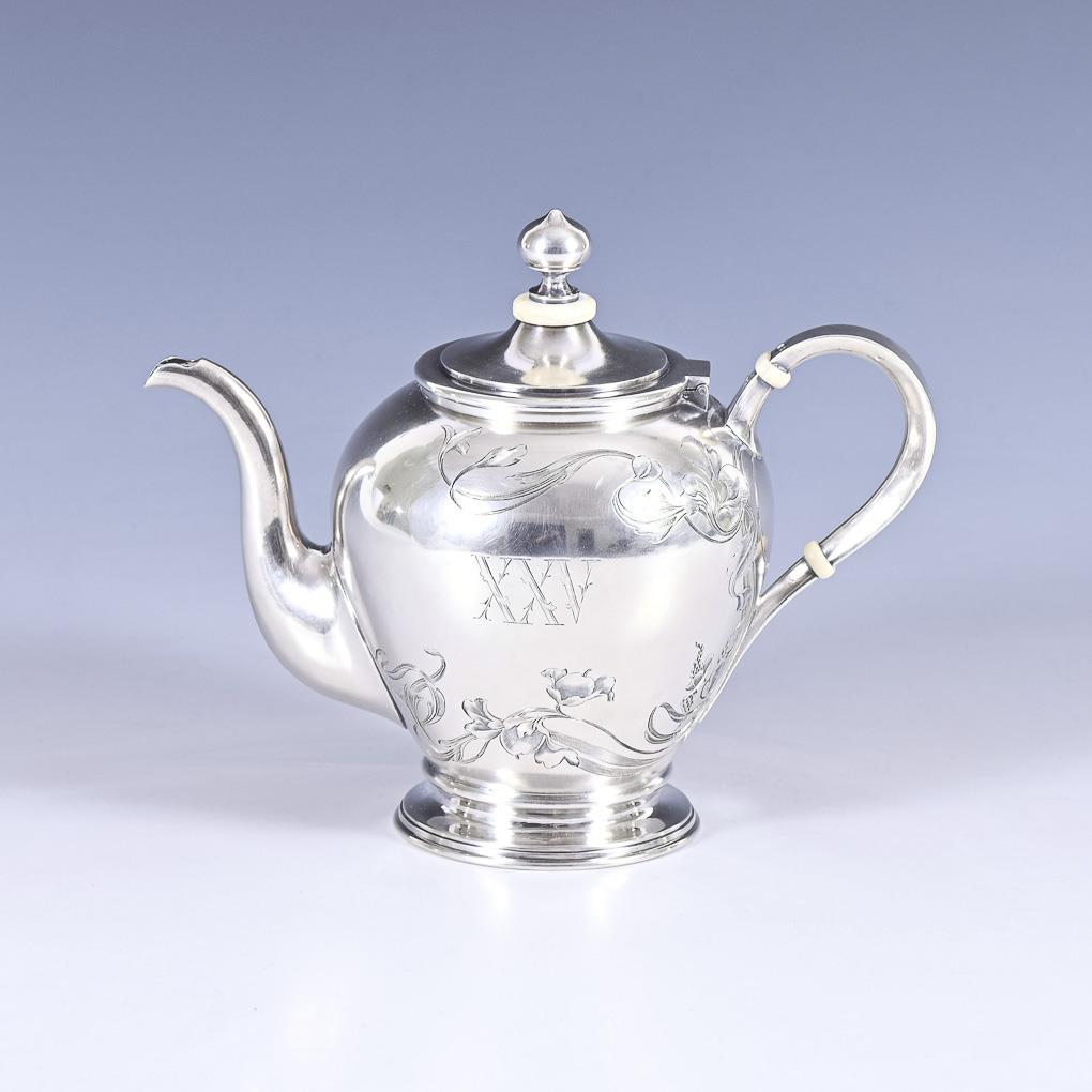 Small, bulbous silver jug with floral Art Nouveau engraving and Roman numeral "XXV". Inside gilded.