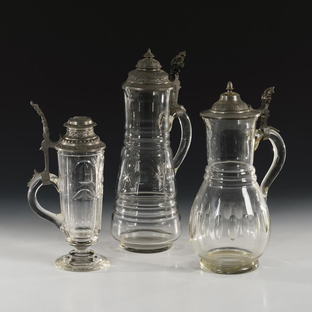 Colorless glass, tin. H jugs 34 and 38,5 cm, H beer mug 30 cm.