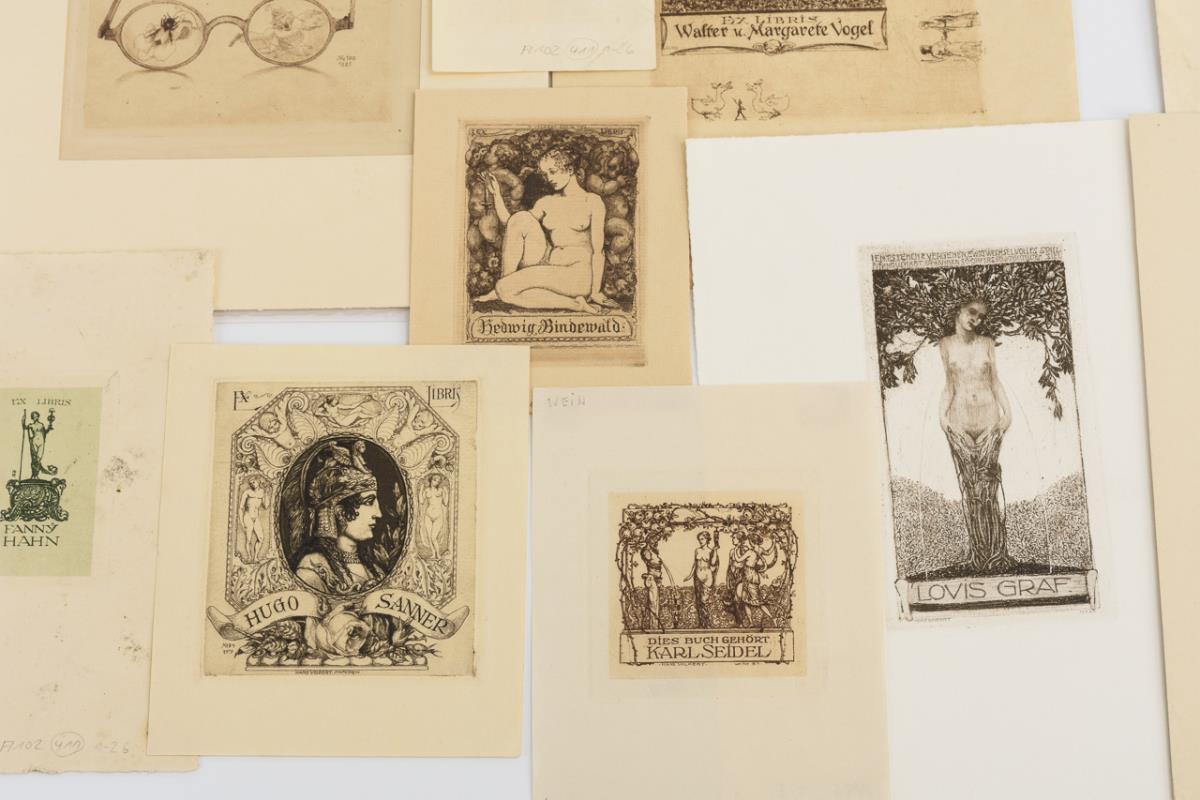 Collection with 16 different bookplates: No. 6, 17, 26, 29, 2x 31, 32, 49, 59, 75, 84, 87, 100, 106, 109 and 161 (here pencil No. 29). Partly spotted.