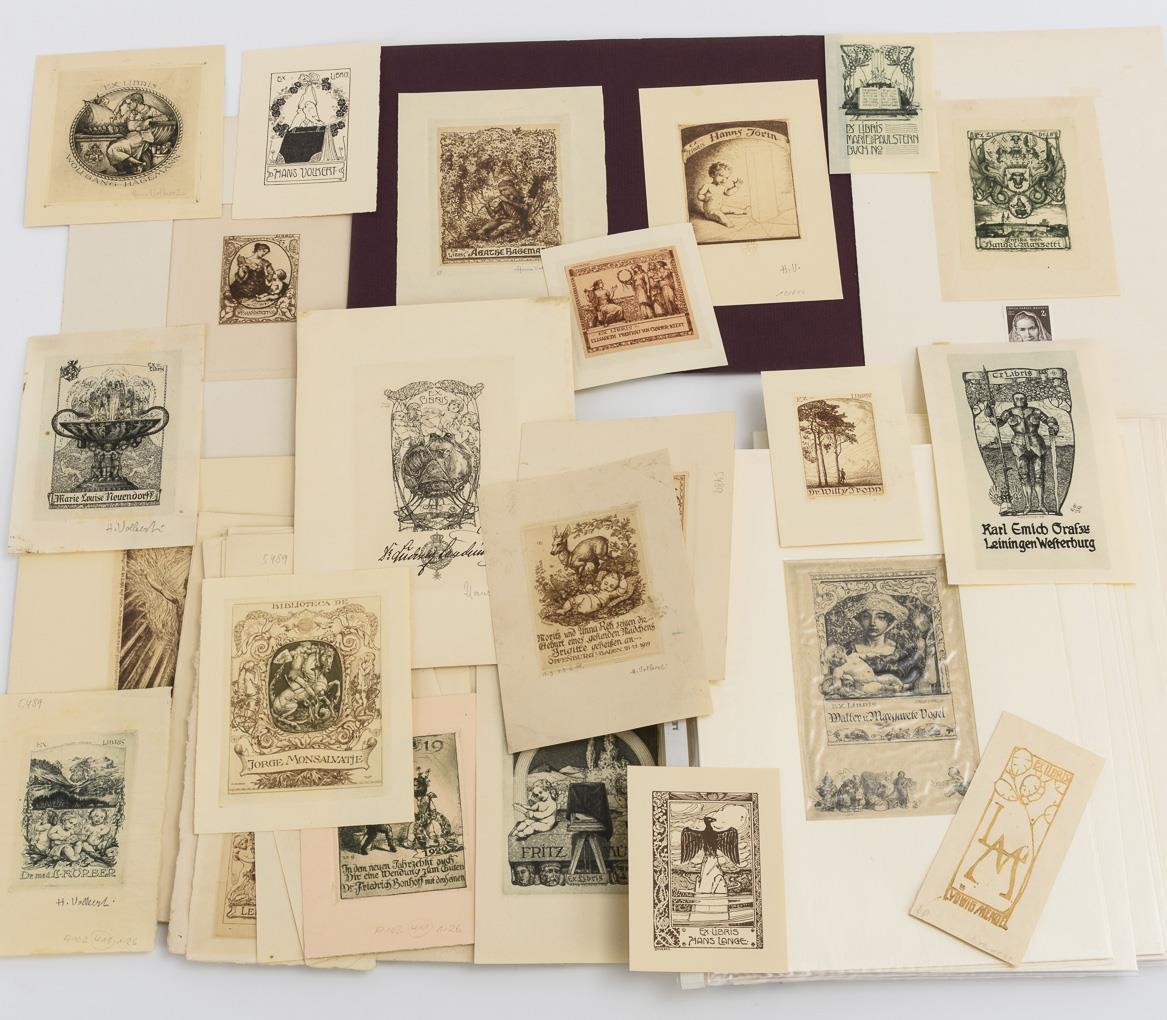 Collection with 59 different bookplates. Partly spotted.