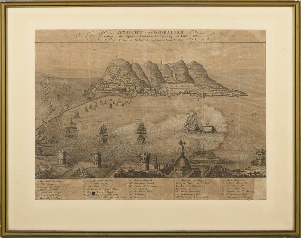 Historical military map: "View of Gibraltar during the Span. u. French. siege in 1782. Weimar in the publishing house of the geograph. Institut. 1806", with legend. Sheet with strong light damage, bow folds, water damage.