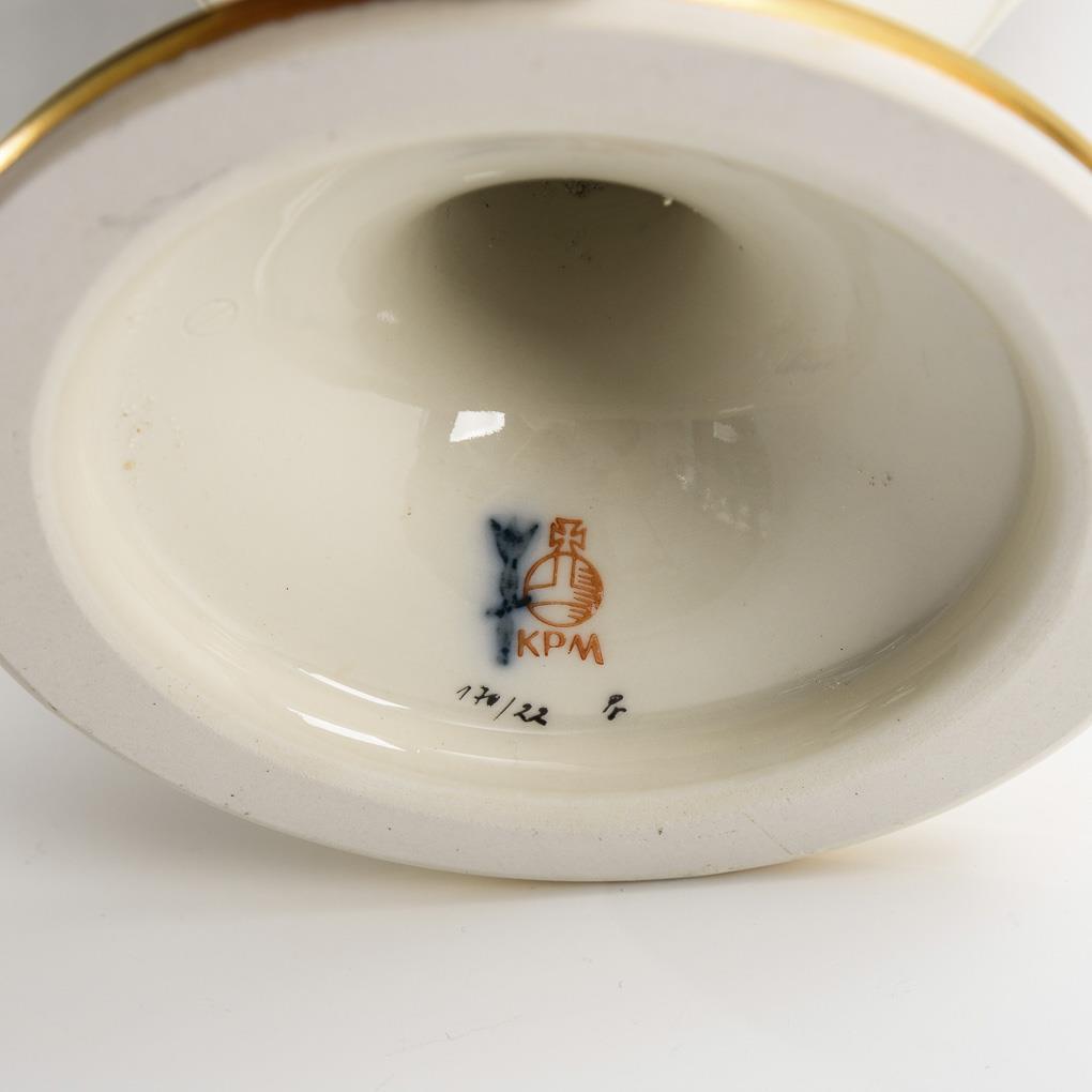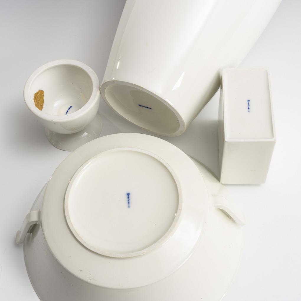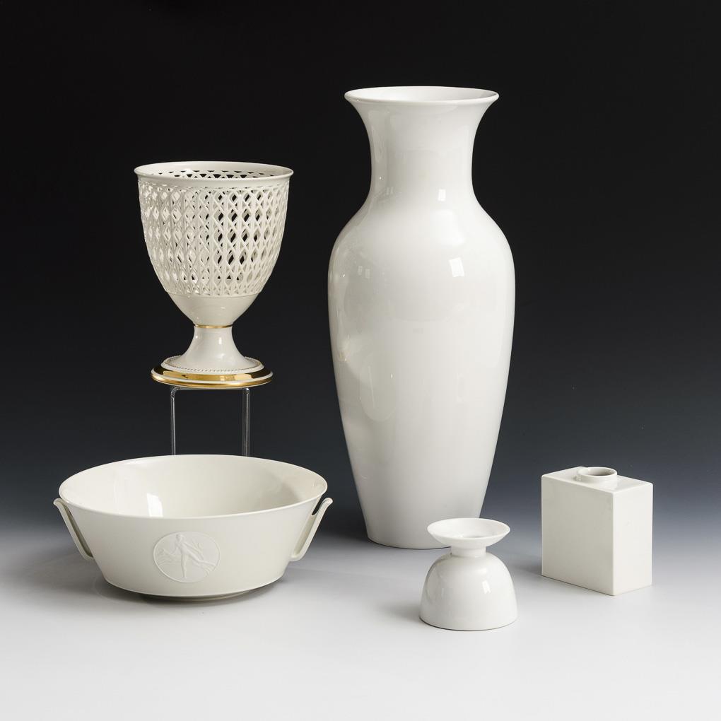 Baluster vase (h 40 cm). / Sugar basket (h 19 cm; without insert). / Bowl "Arcadia" (Ø 23.5 cm). / 1 tea caddy (H 9,5 cm; without lid). / 1 foot bowl (H 7.5 cm; lid missing).