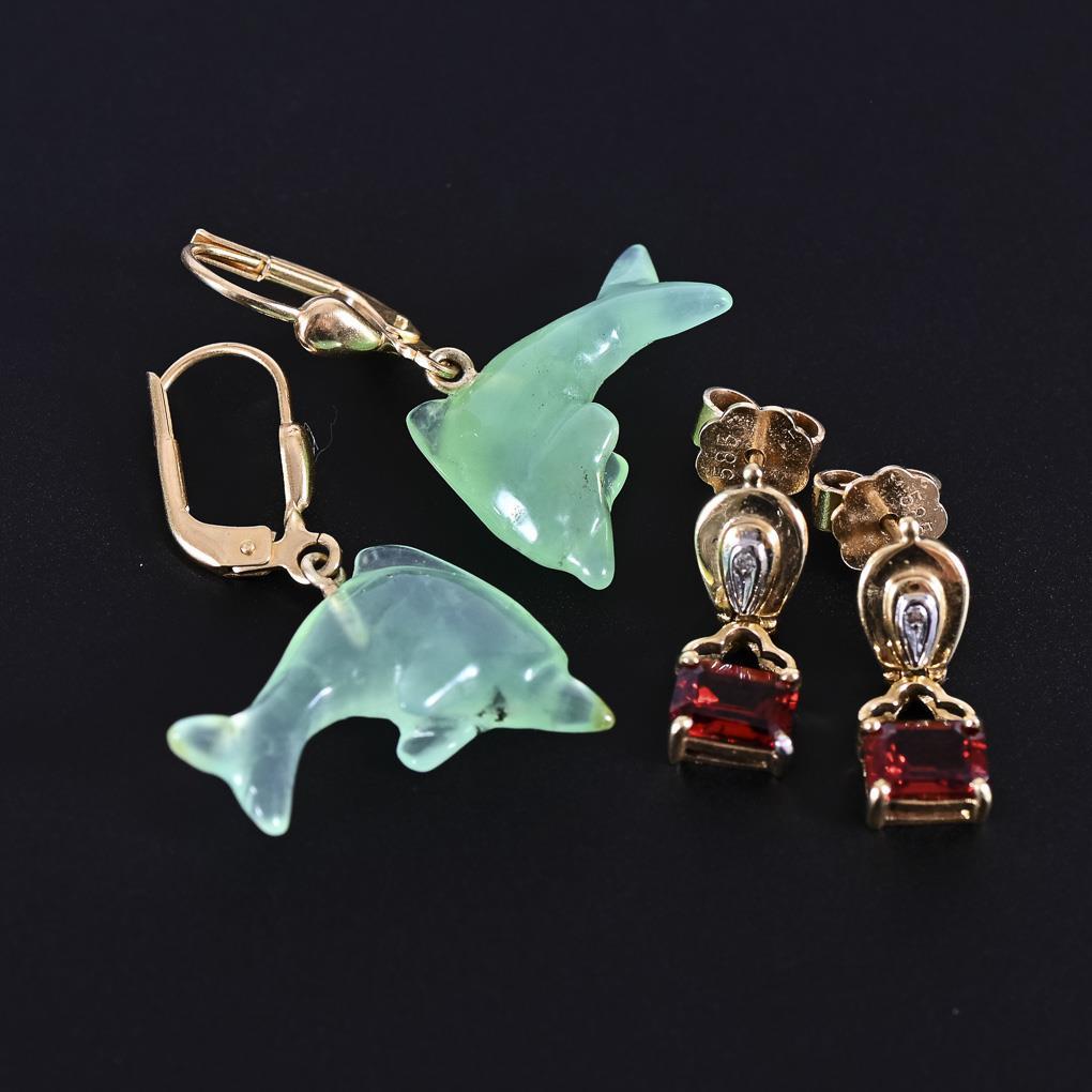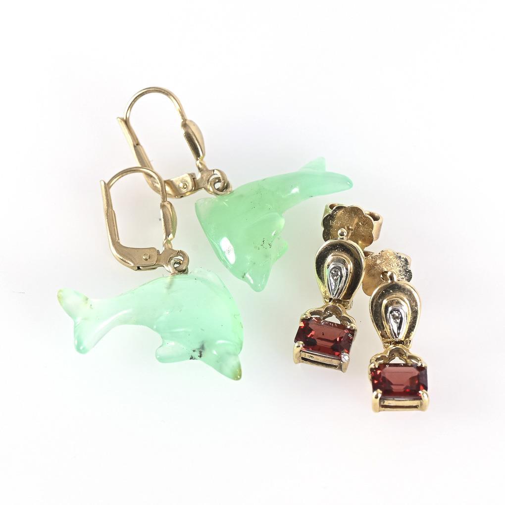 Suspended chrysoprase dolphins and claw-set garnets, on spring bail and plug-in mechanism.