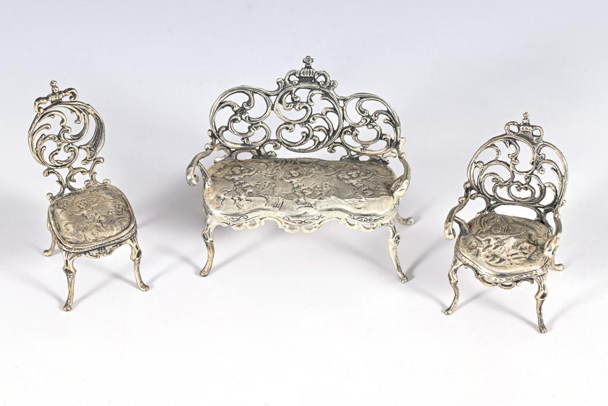 5 silver miniature furniture. Gebrüder Kühn, Schwäbisch Gmünd.