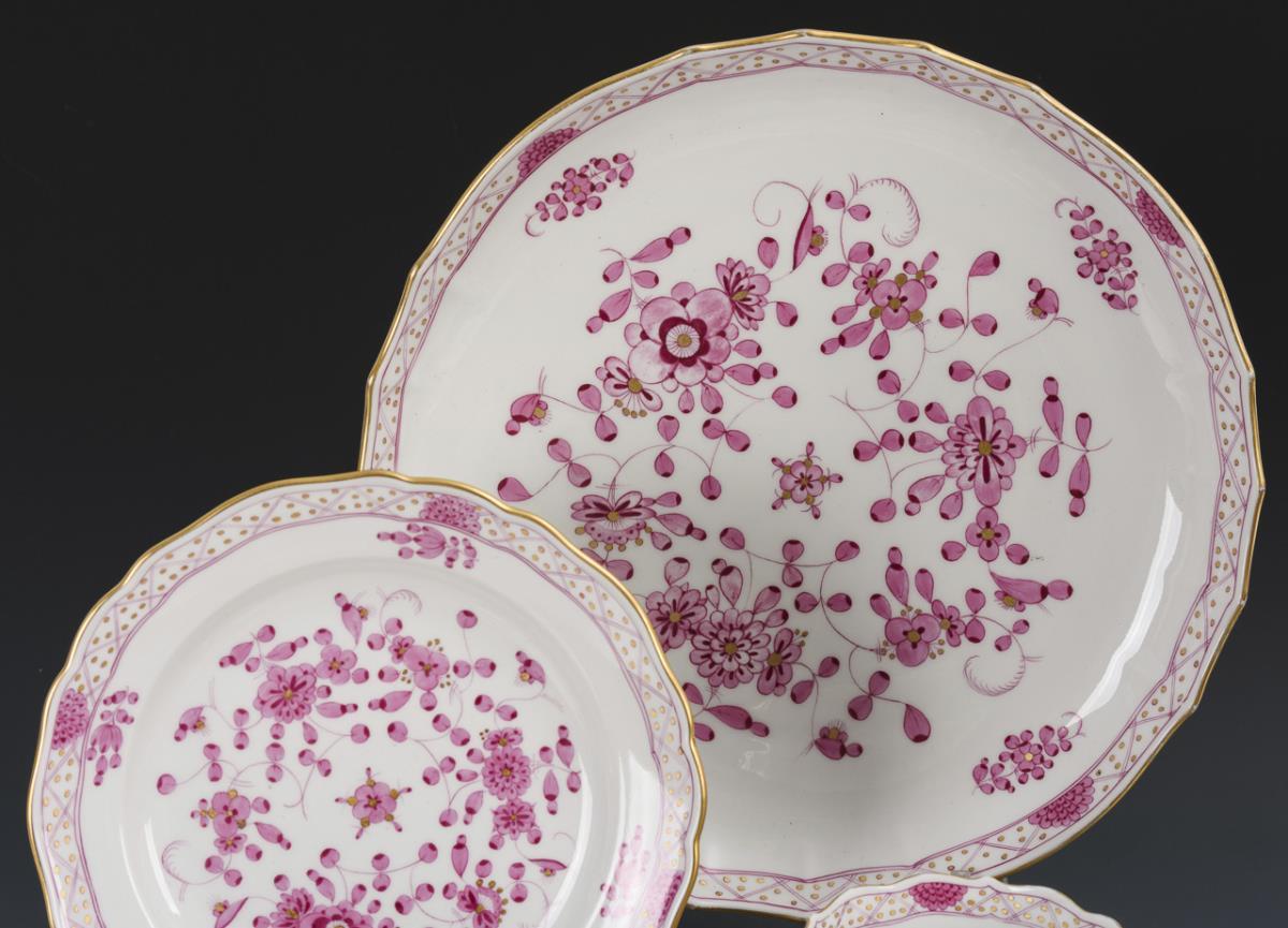 56+1 parts. Form "New Cutout". Coffee pot (h 24,5 cm), teapot, creamer, sugar bowl, 12 cups with 12 saucers, 12 cake plates, 1 credenza plate, 2 demitasse cups with 2 saucers, 7 four-pass bowls (l 10,5 and 19 cm), 2 ashtrays, 1 leaf bowl, 1 saucer (form "Large Cutout"). In addition, 1 coffee pot lid. 3 cups and 1 saucer with edge bumps, partially slightly gold rubbed.