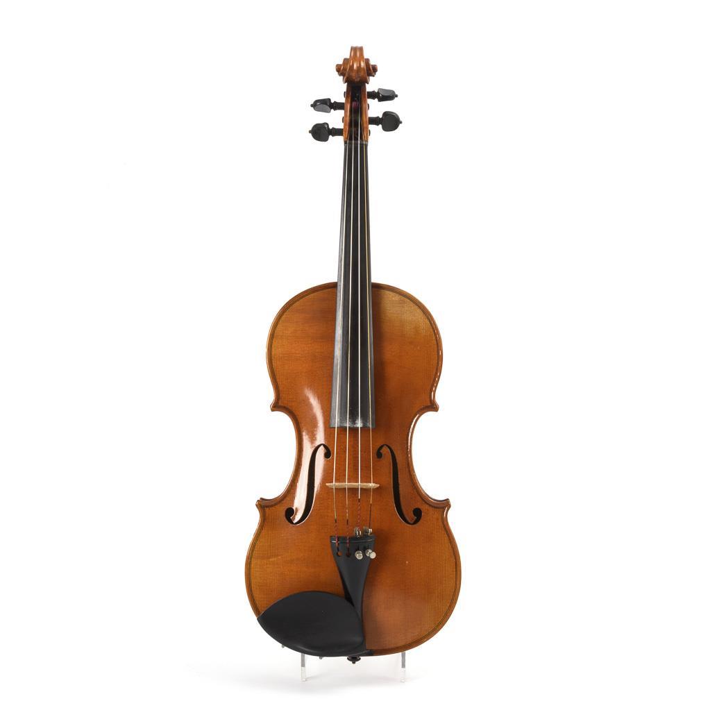 Violin after a model by Joseph Guarnerius del Gesu. Edge inlay made of 2 strings, chin rest. Bow with round stick. Comes with shoulder rest and adjustable tuner. In black box. Minimal varnish damage to top and bottom, otherwise good playing condition.