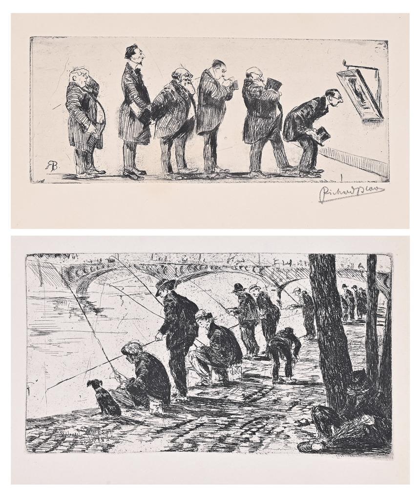 "Les pêcheurs" - Fishermen on the Seine in Paris: etching, plate: 12.7 x 22.7 cm, sheet: 20.7 x 27.2 cm, signed in the plate | Gentlemen in the Museum: etching, pencil signature, plate: 11.5 x 28.7 cm, sheet: 28.5 x 46.3 cm, some foxing.