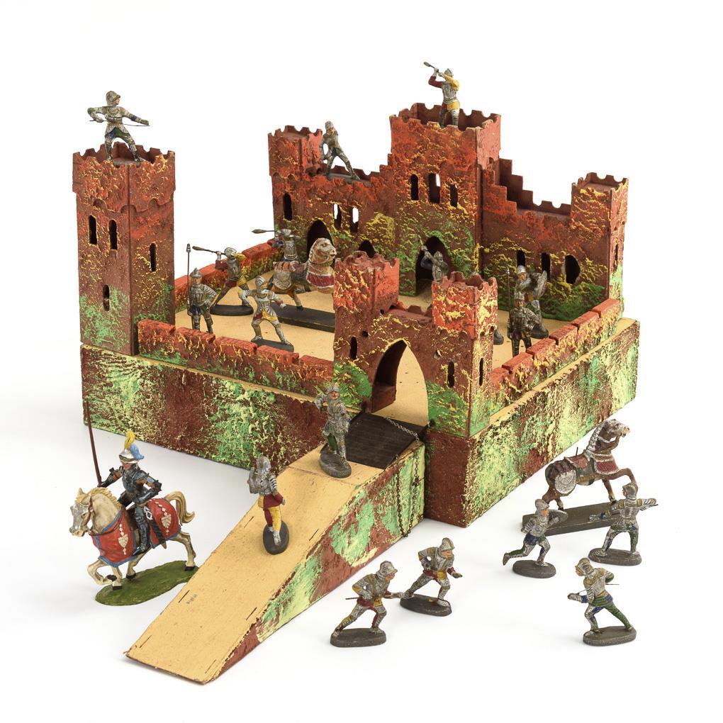 Castle complex with drawbridge and ramp (25 x 37.5 x 31.5 cm), plus 3 horses (1x plastic) and about 19 knights. With defects.