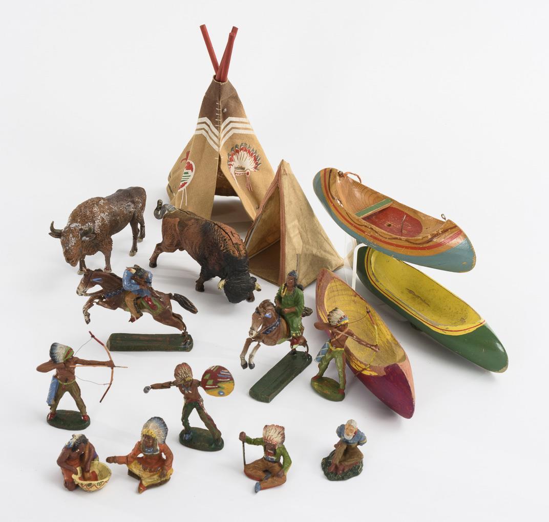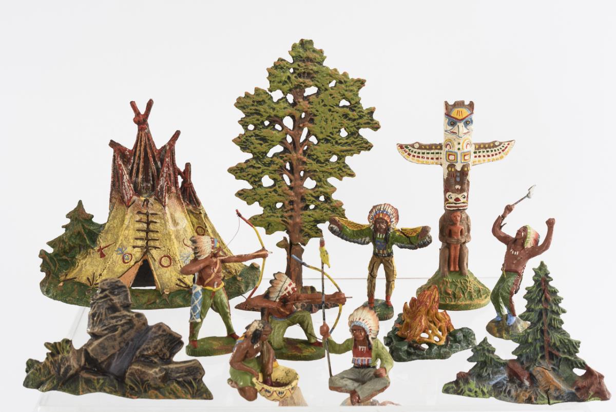 13 figures, 2 riders, 2 buffalo, campfire, stake, trees, 3 tents (2x made of cloth) and 3 wooden boats. Parts with defects.