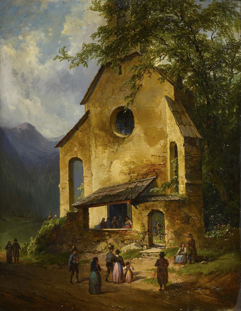 The Alpine people on a sunny day in front of the entrance to the church. Dry tears.