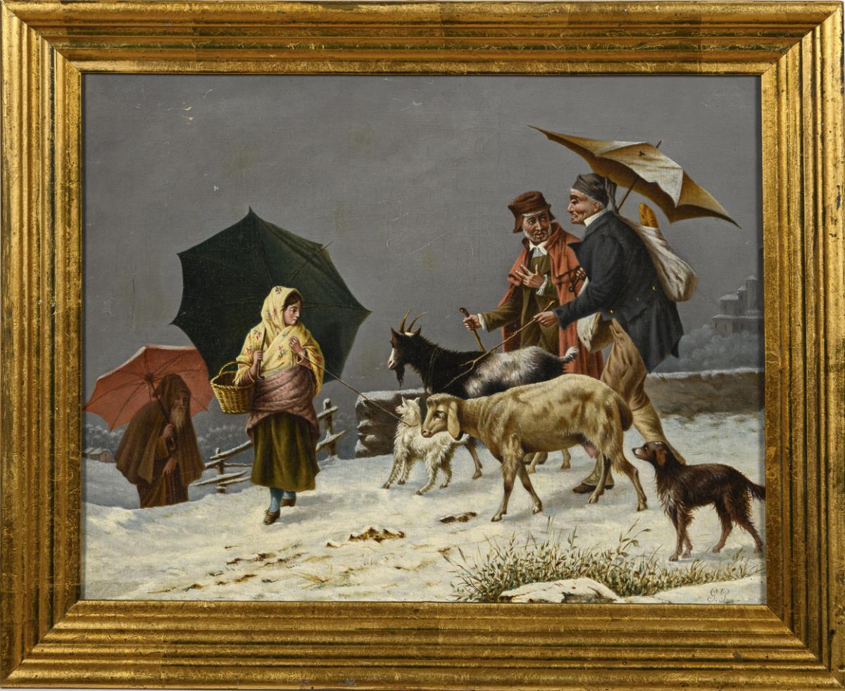 Various people on a snowy road with the cattle under a gray sky. canvas doubled.