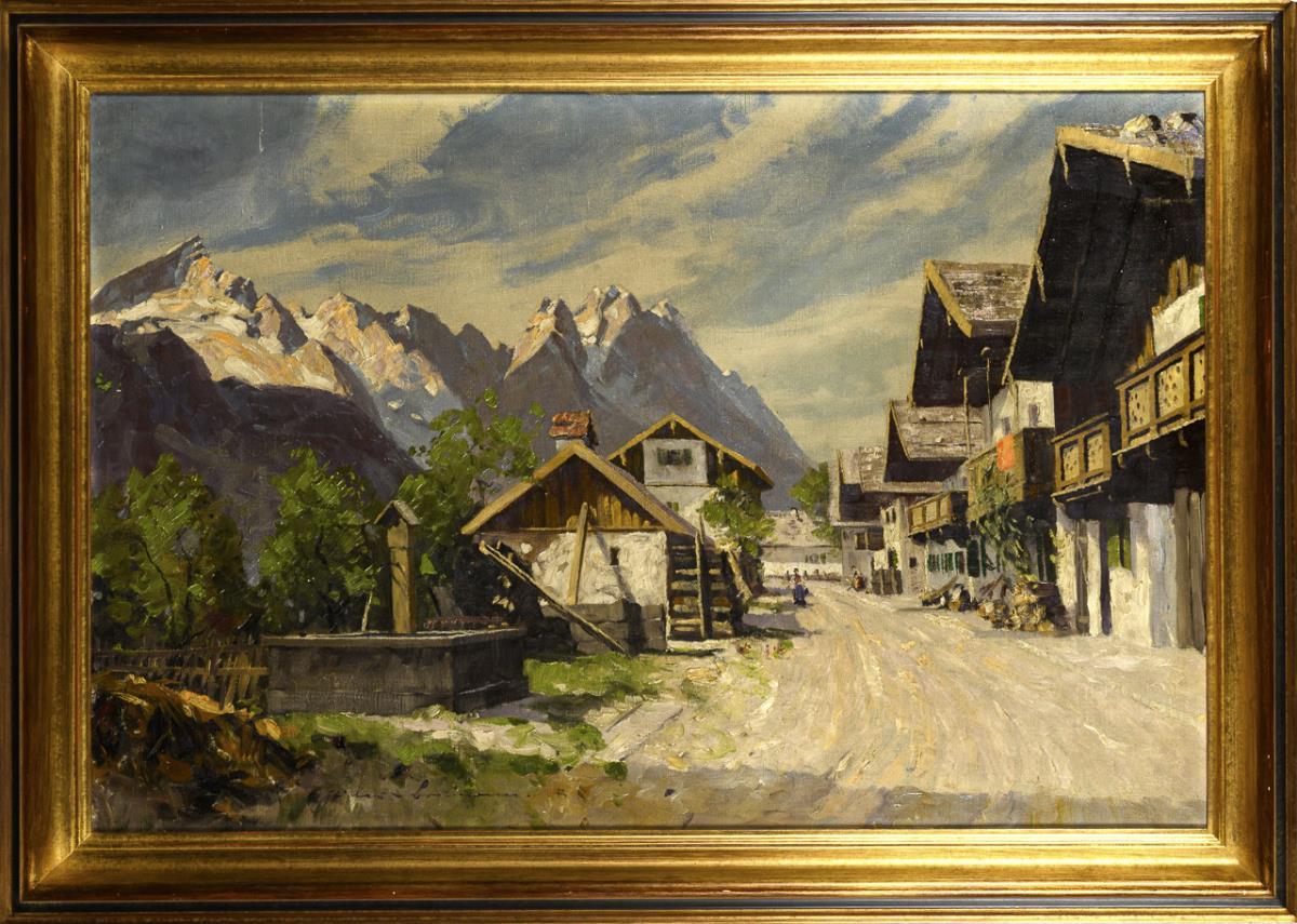 Staffage figures on the street in the sunshine with the mountains in the background. A small restored spot with backstaining.
