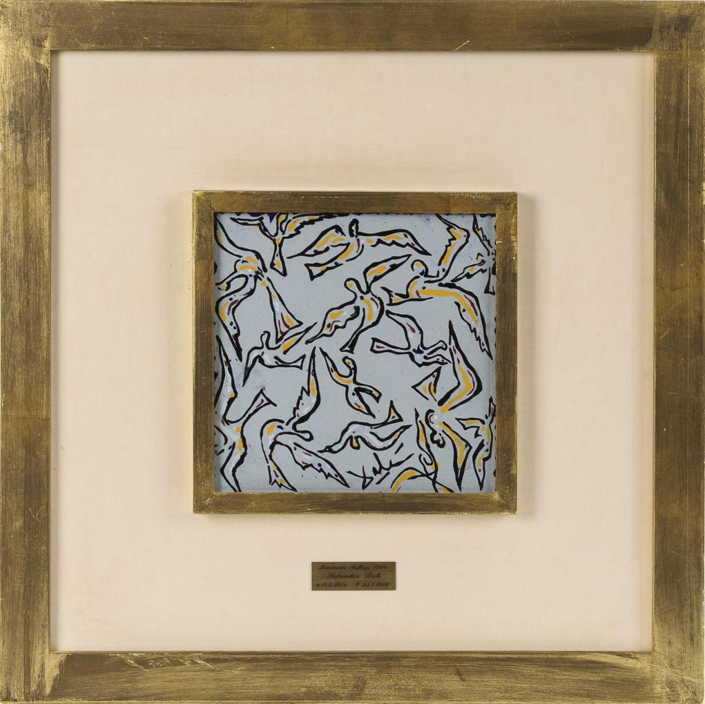 1 of 6 single motifs from the series "Spanish Impressions" with imaginative composition of birds in flight. Verso certificate. Frame with bumps.