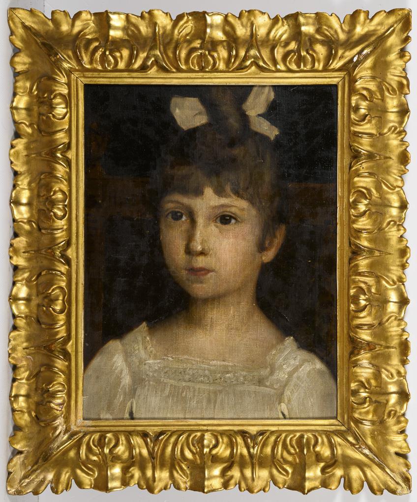 Portrait of a girl in a white dress and with a white bow in her hair. Traces of age.