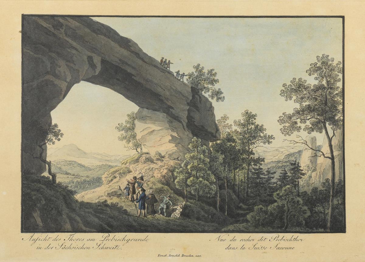 Biedermeier "View of the Gate at the Prebischgrunde in the Saxon Switzerland", also titled in French "Vue du rocher dit Prebischthor dans la Suisse Saxonne". Stick spotted.