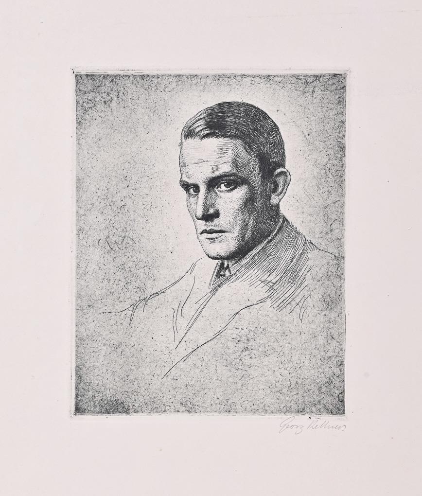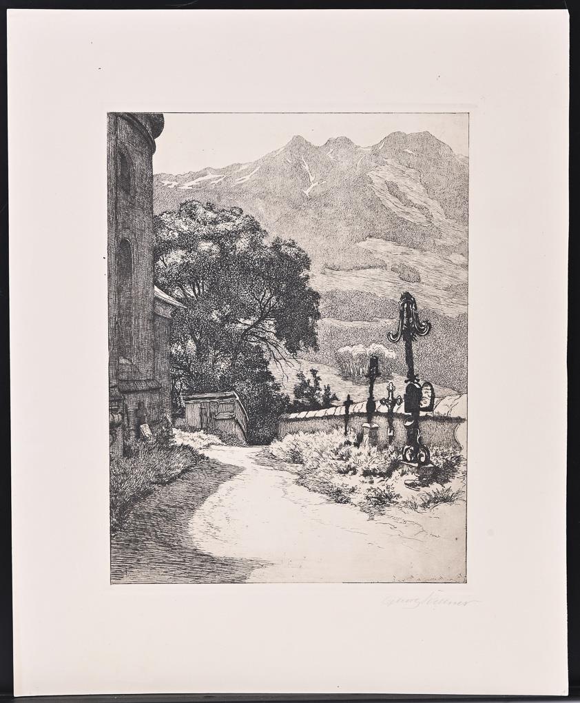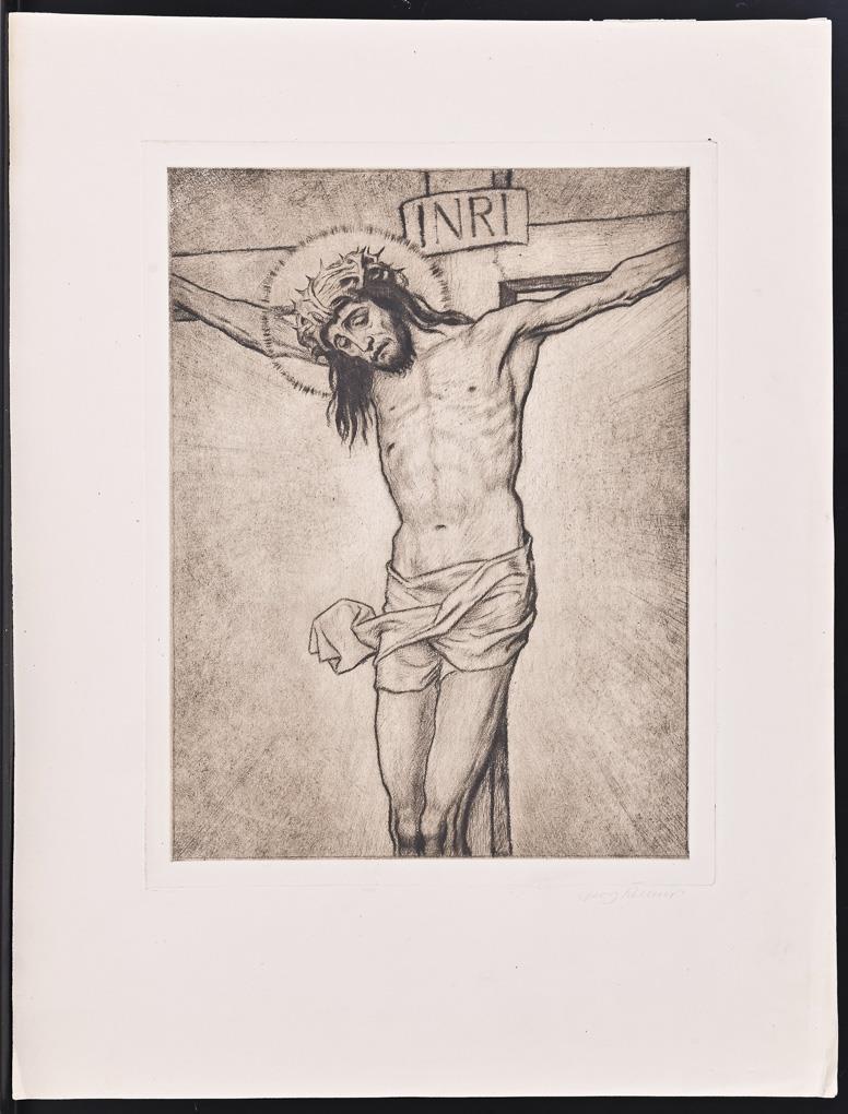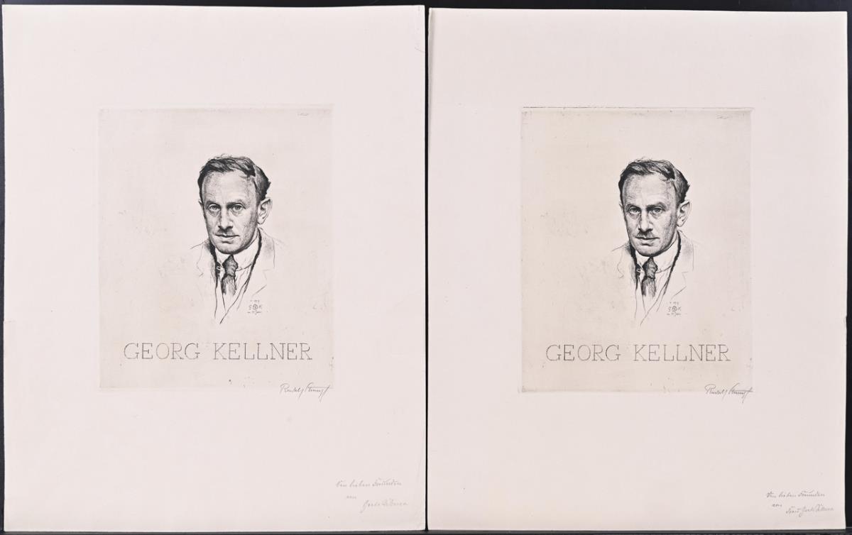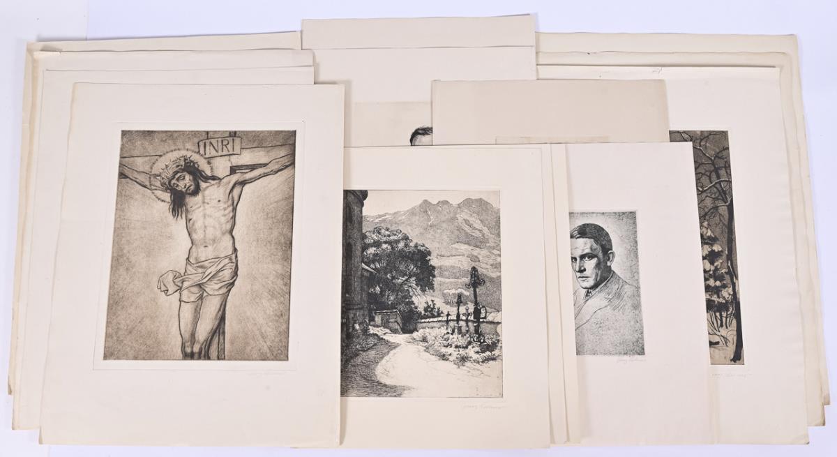 3x print of plate with snow-covered coniferous tree, 3x print of plate with winter landscape, 4x print of plate with crucifix, 2x print of plate with portrait of the artist - with indistinct pencil signature and dedication "Den lieben Freunden von Georg Kellner", 1x portrait of the artist, 1x older gentleman with violin and cat sitting on a bench - verso titled "Kellner's Uncle Hammer?". Marginal area each somewhat creased or cracked, partly with light damage.