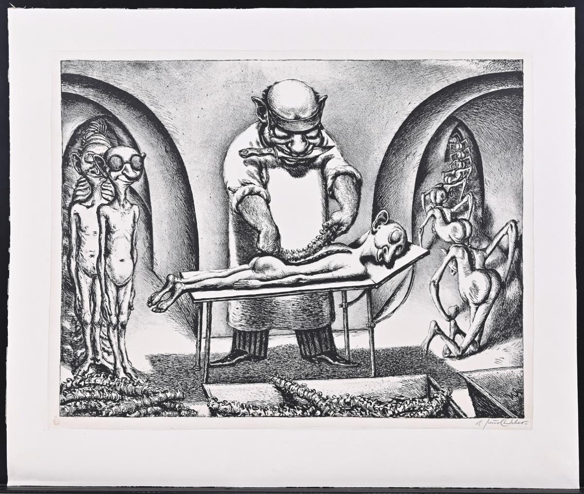 "Backbone out!". After this sheet was a poem by Hermann Mostar, which Weber published in 1961 together with the picture in the "Critical Calendar": [...] A quick cut, your backbone is missing,/ and what you just tormented,/ Is now directly pleasurable,/ In the military service robbt's like lubricated,/ In office crawls's exquisite./ And if you want to be safe somewhere,/ You crawl in quite effortlessly,/ Hasn't the doctor confessed:/ One hardly misses a backbone -/ There was never much there [...]" Quote taken from A. Paul Weber - Museum: https://www.weber-museum.de/werk/gesellschaftskritik.html. Marginal area somewhat creased, verso with traces of glue.