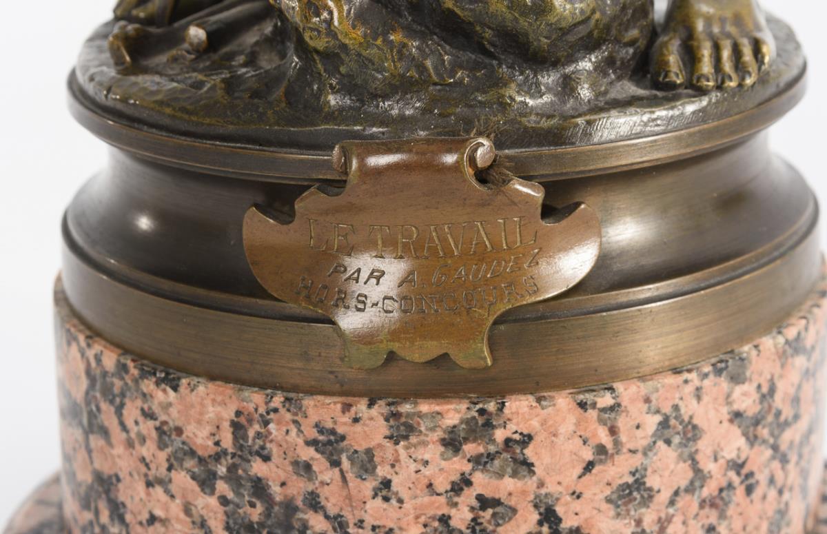 Bronze patinated, marble base. Inscribed, foundry mark "O.G. Bronze Garant au Titre", inscribed on base plate with addition "Hors Concours", titled "Travall". H 39 / 51 cm.