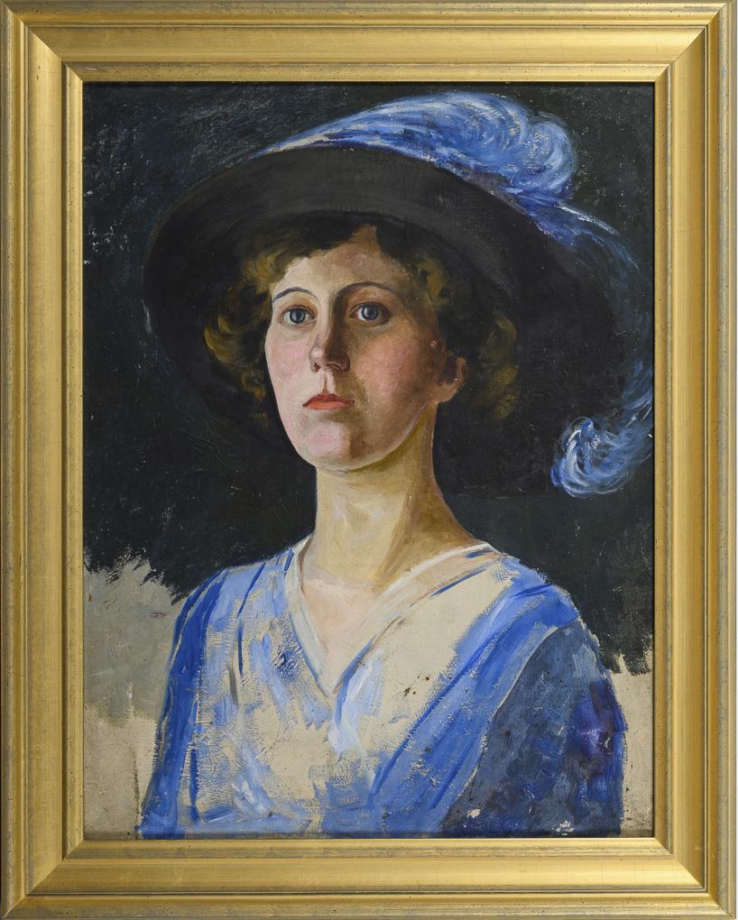 Portrait of a young woman in a blue dress with a large hat.