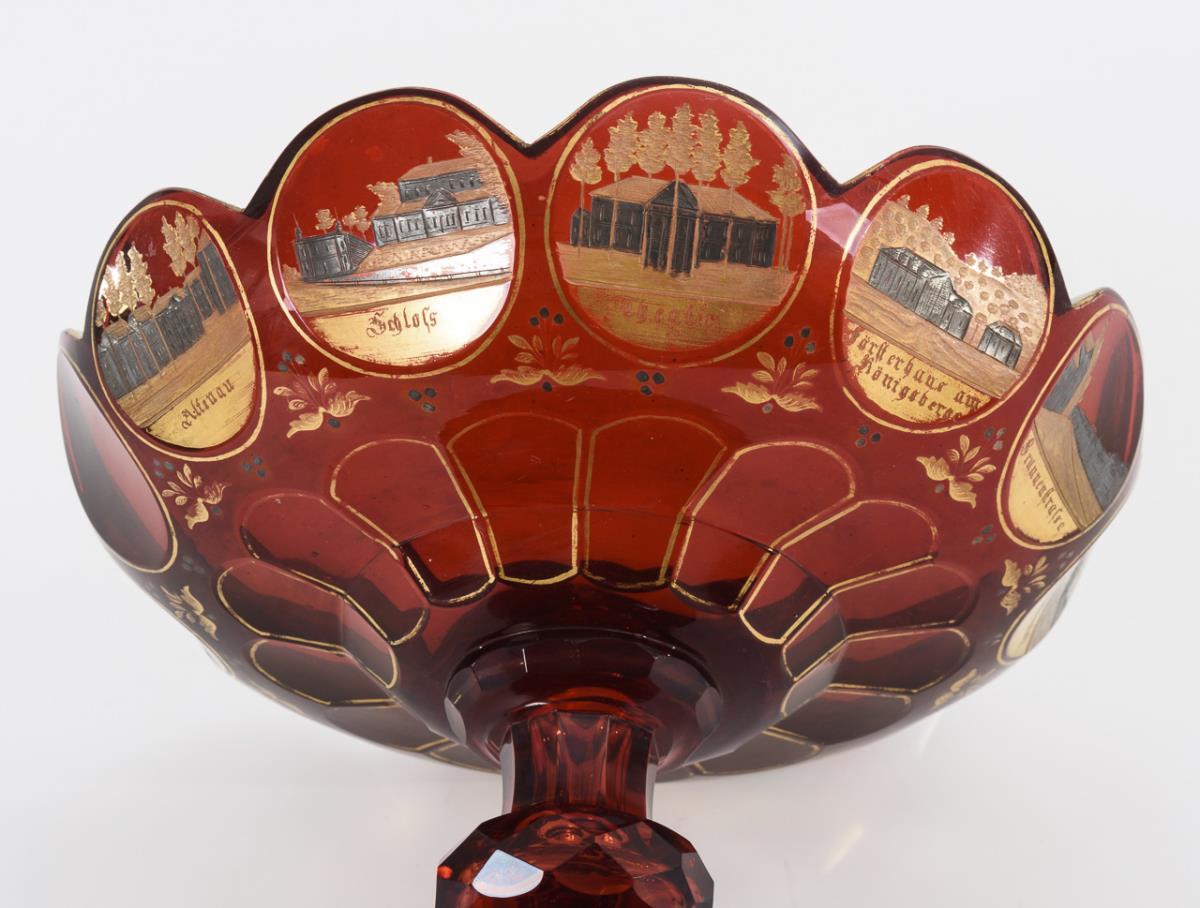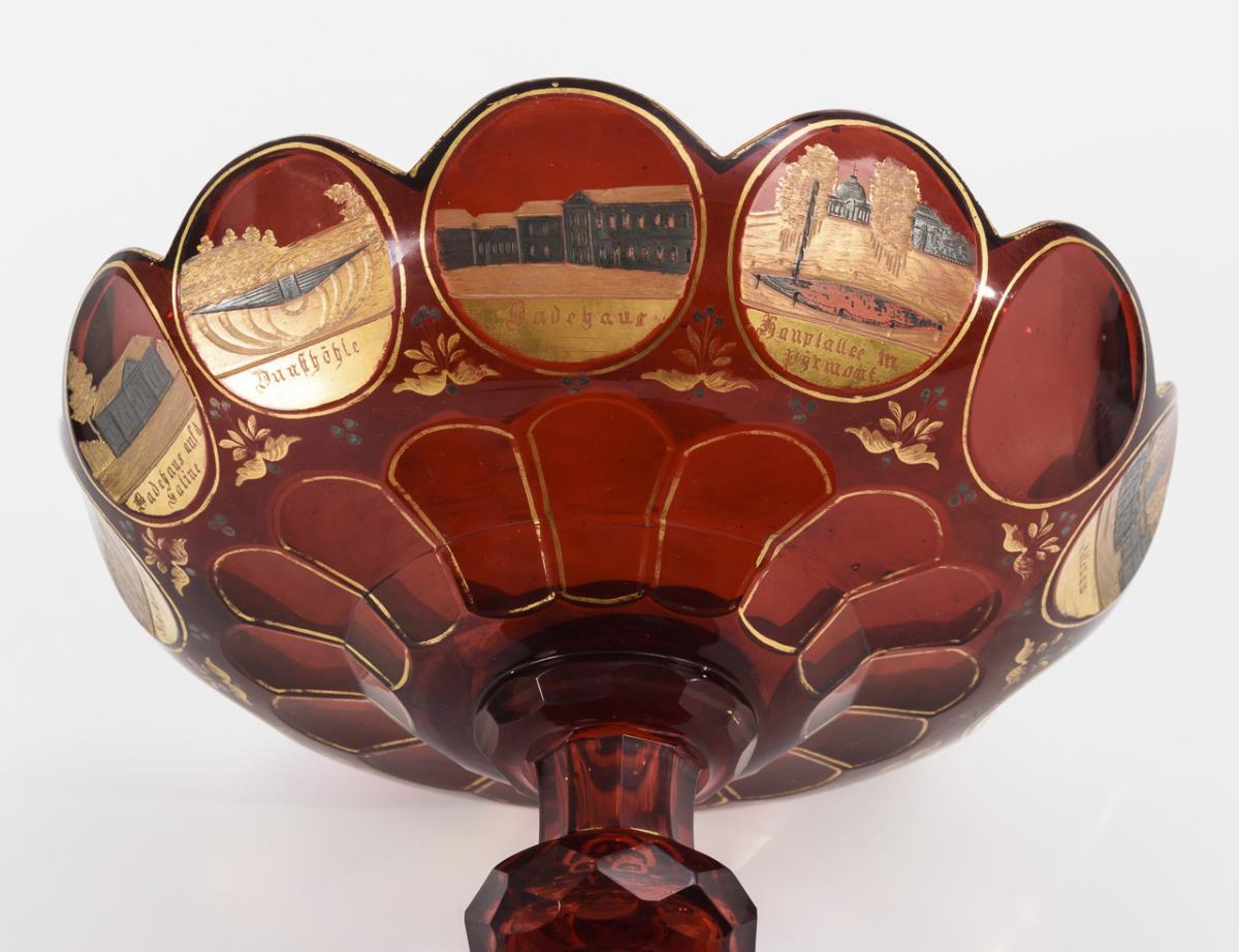 Faceted bowl with multi-pass rim at base, faceted stem with honeycomb-faced nodus, multi-pass foot. With eleven engraved and silver and gold decorated inscribed views of Bad Pyrmont. Gold rubbed.