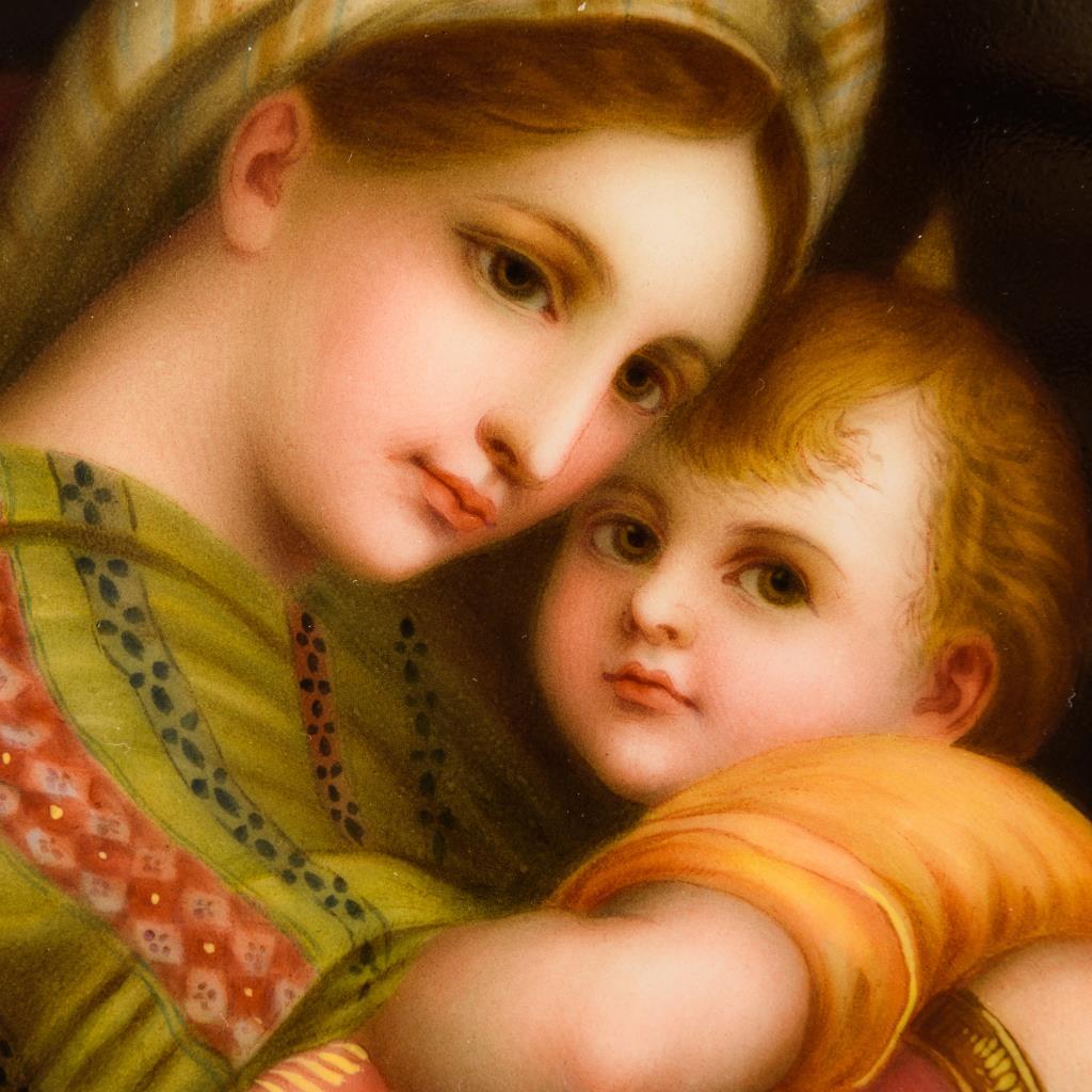 Runde Platte mit der Darstellung der Gottesmutter Maria mit dem Christusknaben sowie dem Johannesknaben, nach dem 1513 entstandenen Gemälde des italienischen Malers Raffael (1483-1520).