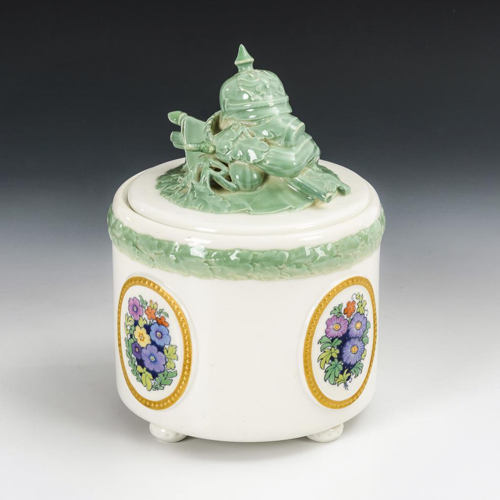 Cylindrical box with four pressed ball feet and oak leaves band in relief, lid with the plastic arrangement of oak leaves decorated military objects (helmet, knapsack, saber, standard). On the can wall four medallions with floral bouquets. 4 bumps on the inside rim of the can, helmet tip, 1 saber handle as well as standardard tip restored.