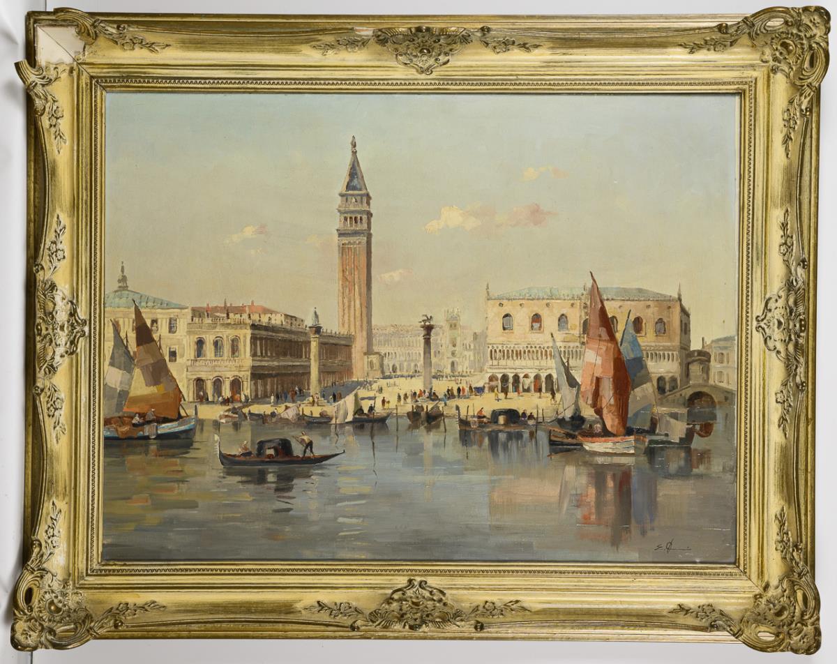 Many boats and gondolas in front of the entrance to St. Mark's Square in the Italian city.