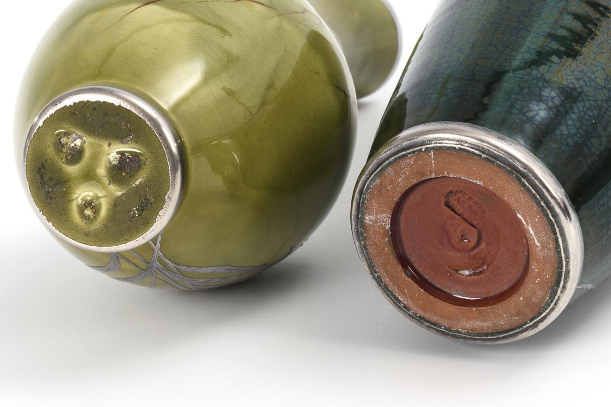 2 Art Nouveau vases with silver overlays. Jean Baptiste MASSIER "Jérôme fils" (1850-1916).