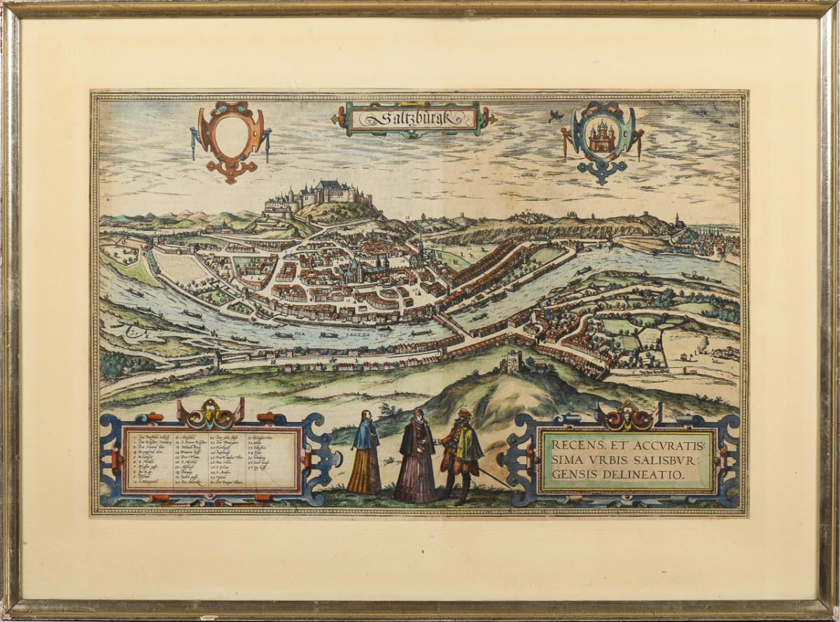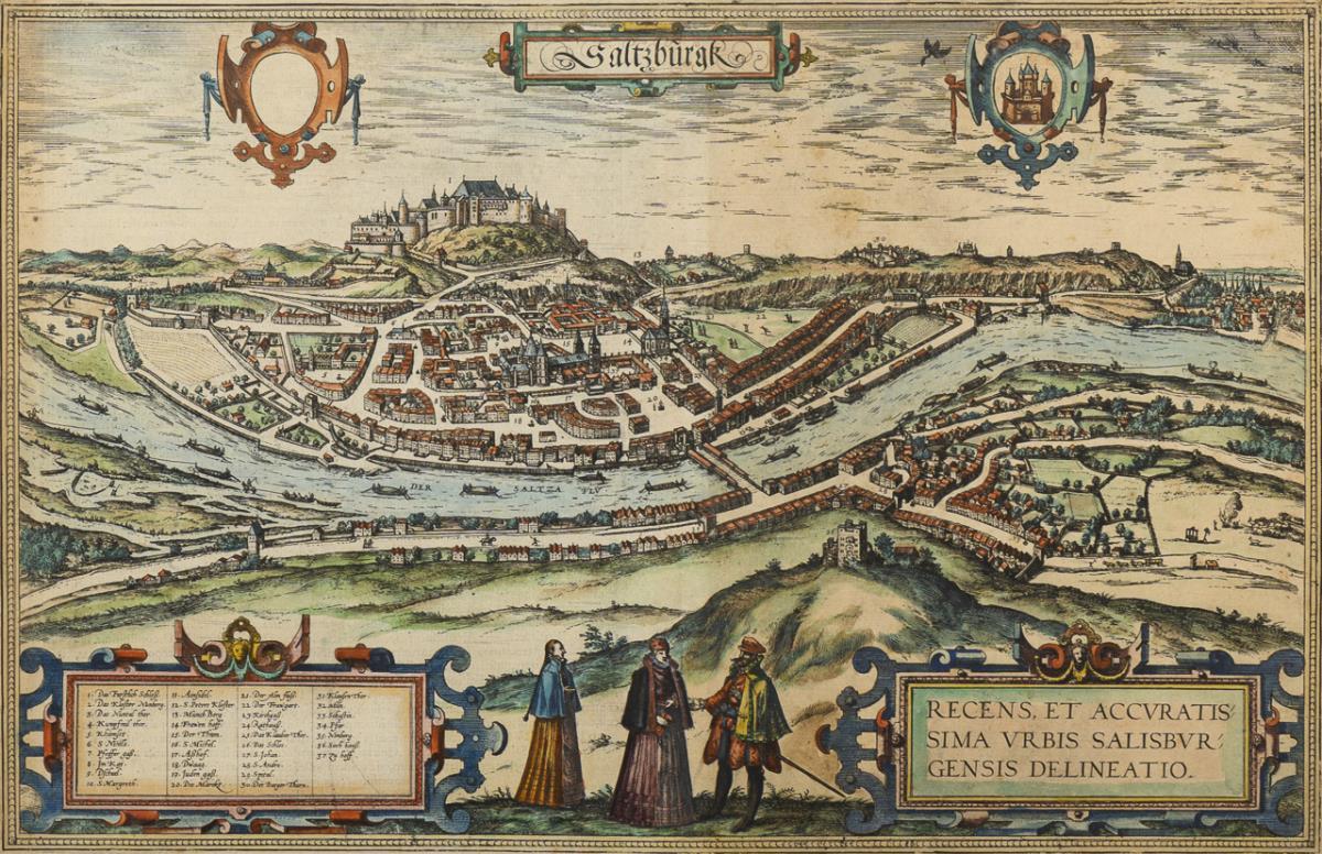 Historical view of the city of Salzburg "Saltzburgk", with scrollwork cartouches, therein title "Recens, et Accvratissima vrbis Salisbvrgensis delineatio" (Current and accurate representation of the city of Salzburg) and legend in German, in the foreground staffage figures; from: "Civitates Orbis Terrarum", 1572 - 1618 (vol. 3); verso accompanying text in Latin. Sheet browned, foxing, centerfold.