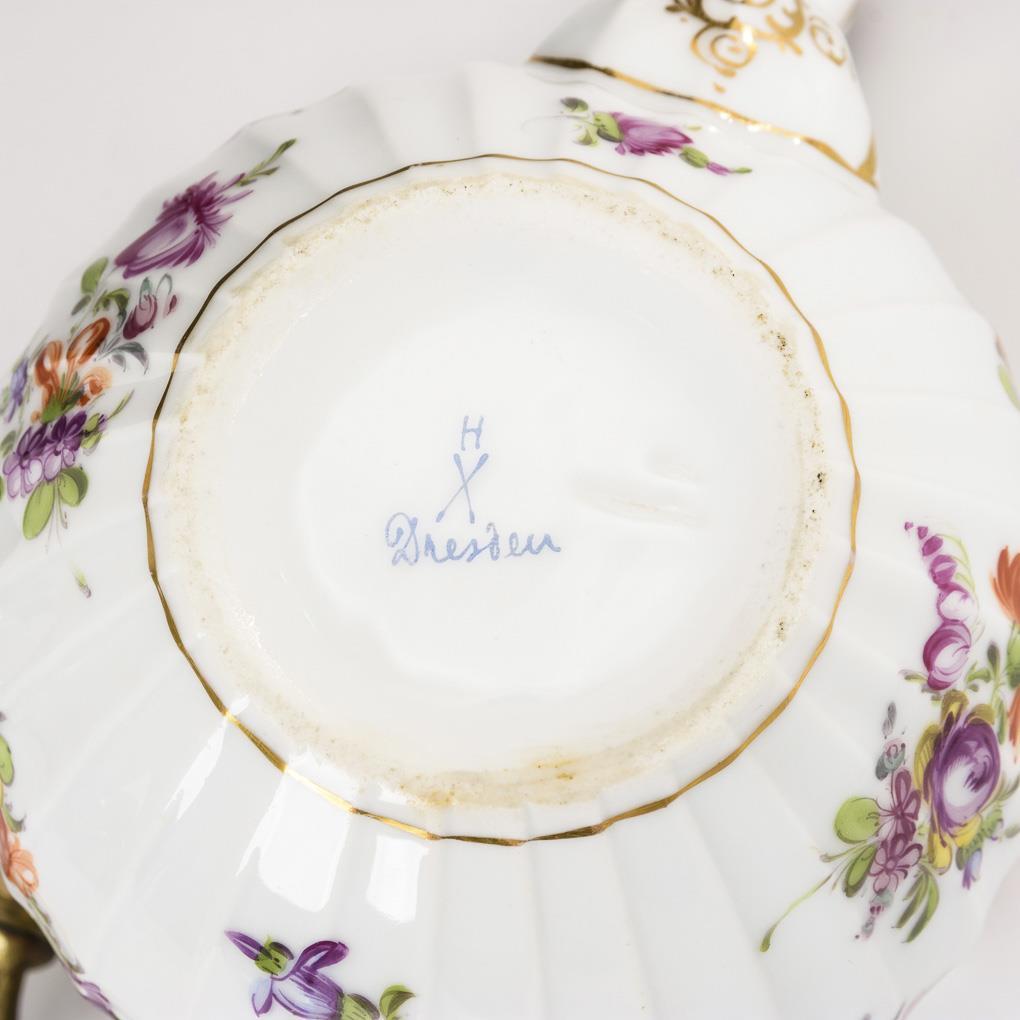 Bellied, fluted jug with bronze-mounted bow handle and knob lid. Circumferential painted floral garlands. Partial gold rubbing.