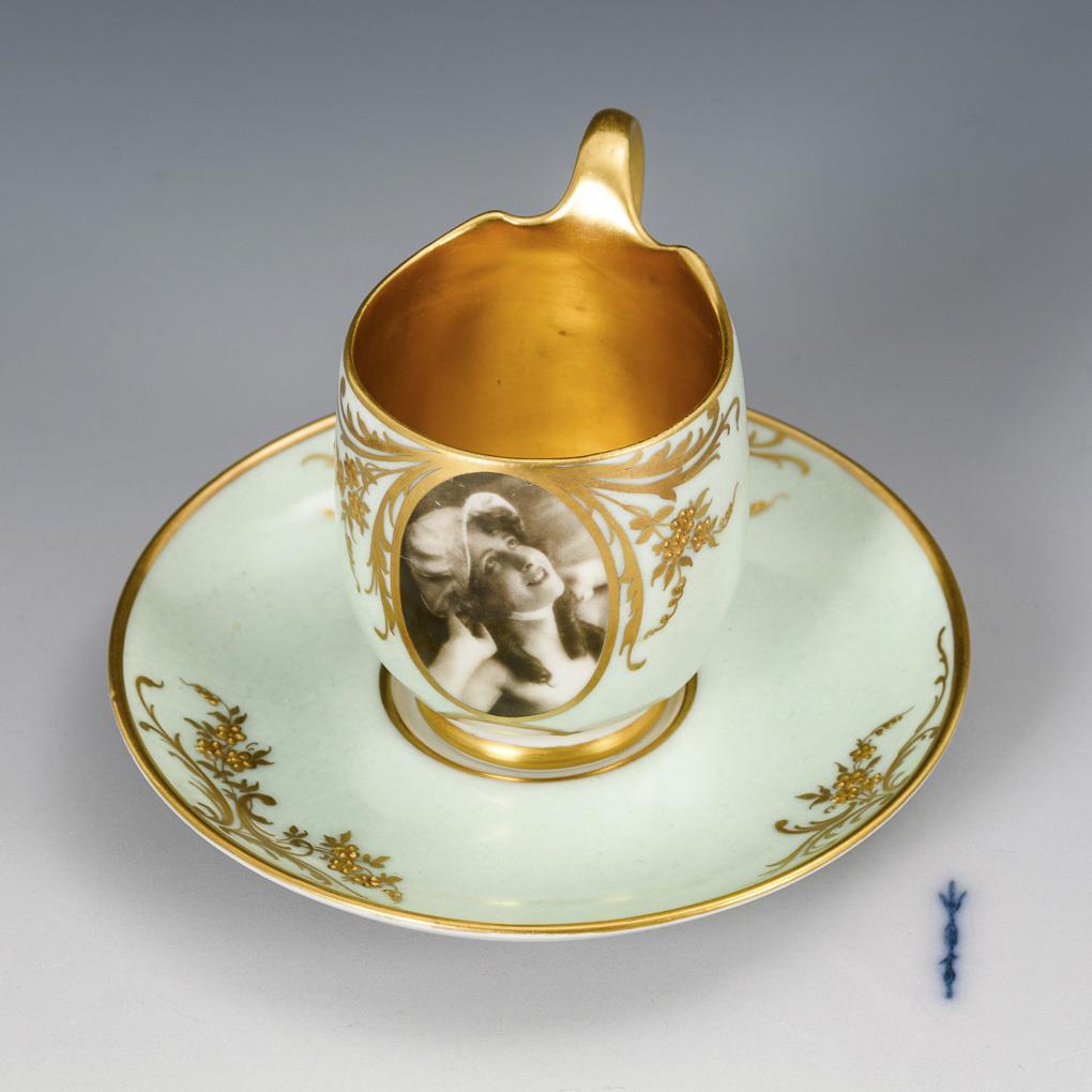 Ovoid cup with curved handle. On the front an oval medallion with a photo of a young lady, in the mirror of the saucer the dedication "Meinem lieben Hans 6.9.21", inside gilded.