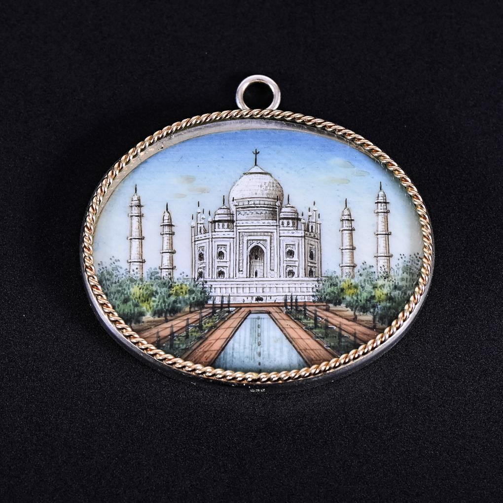 Glazed painted motif of Indian tomb building. Frame setting with back plate and tension ring. Rigid lug.