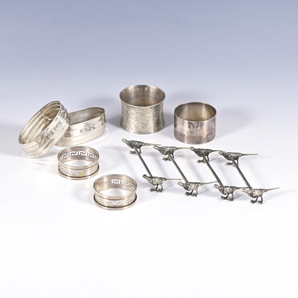 Various napkin rings, some with monogram engraving and 4 identical knife banks with birds.