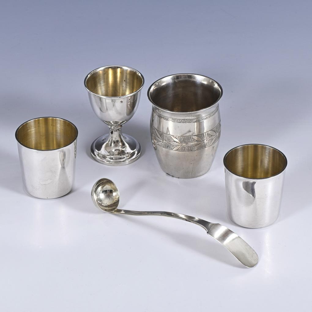Biedermeier cup from 1844 with engraved flower frieze. / 2 heavy liquor cups. / Smooth egg cup. / Silver-plated spoon with trowel-like recessed spoon. Signs of use, partly small dents.