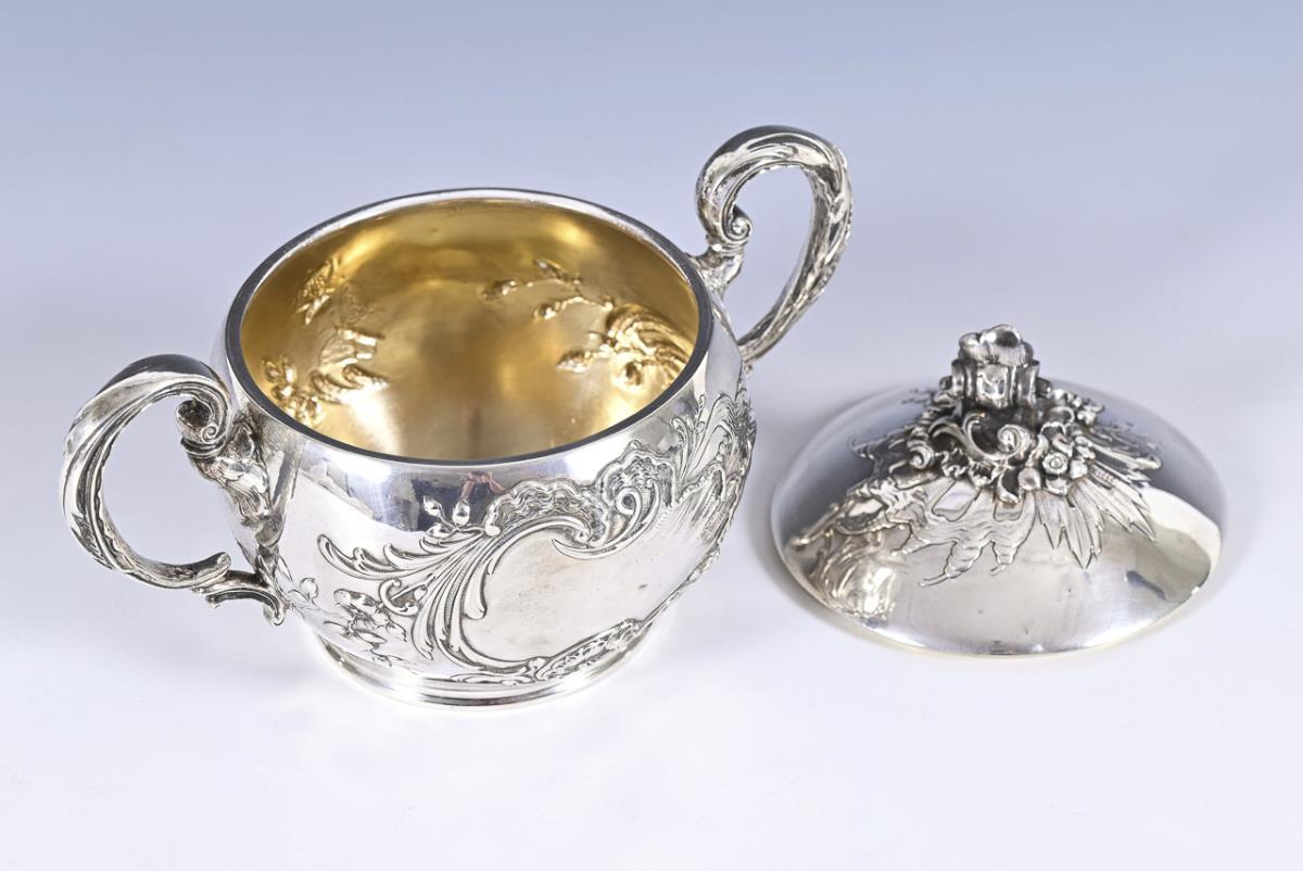 Richly decorated in relief with rocailles, flowers and butterflies: Coffee pot, sugar bowl and Michgießer. Signs of use, some dents.