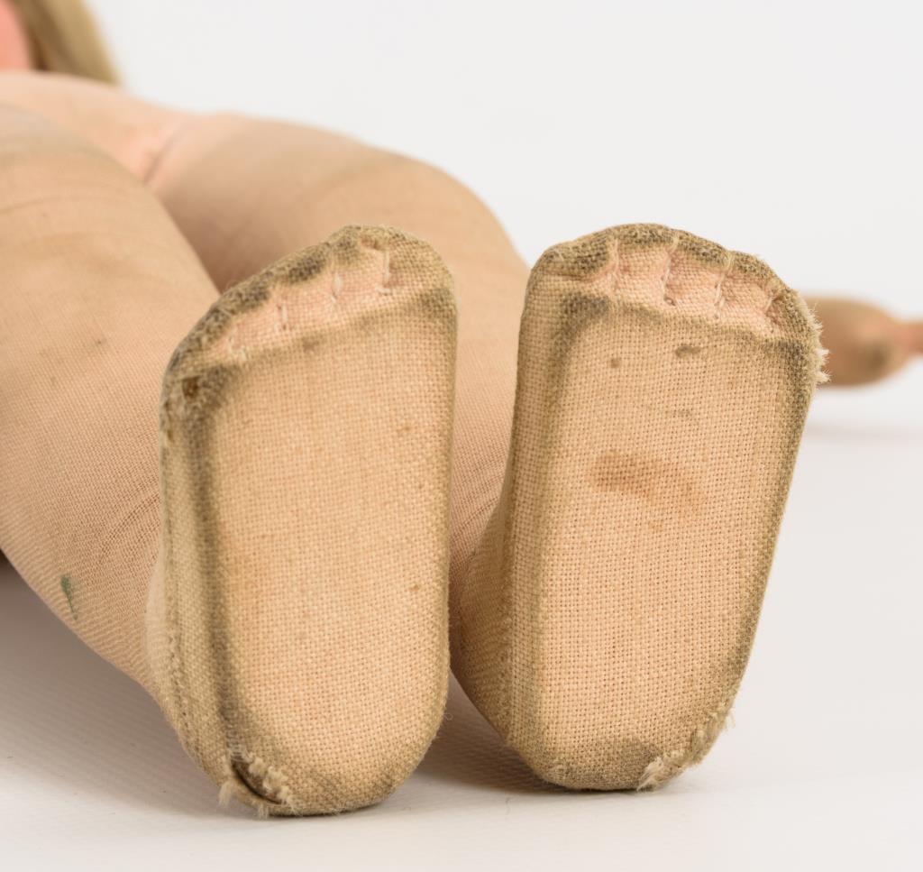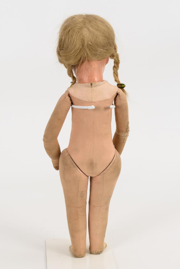 Stoffbezogener Kurbelkopf mit 1 Hinterkopfnaht und blonder Echthaarperücke. Stoffkörper mit locker angenähten Armen, Beine mit Scheibengelenken. Weiße Bluse, schwarzes Trägerkleid mit roten Blüten, rote Schürze, weiße Schuhe. Gesicht mit retuschierten Farbdefekten, linker Arm mit provisorisch reparierten Defekten.