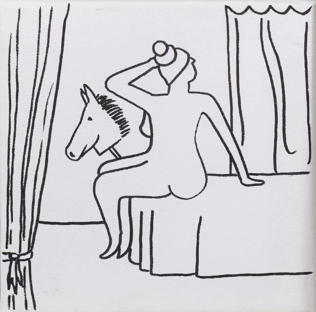 "Nude with horse is a series of 10,000 drawings with the same motif always. Each picture is exactly one euro more expensive than the previous one. For example, the picture Nude with Horse #1/10,000 will cost one euro and Nude with Horse #10,000/10,000 will cost ten thousand euros." (www.aktmitpferd.de), with dedication and insert.