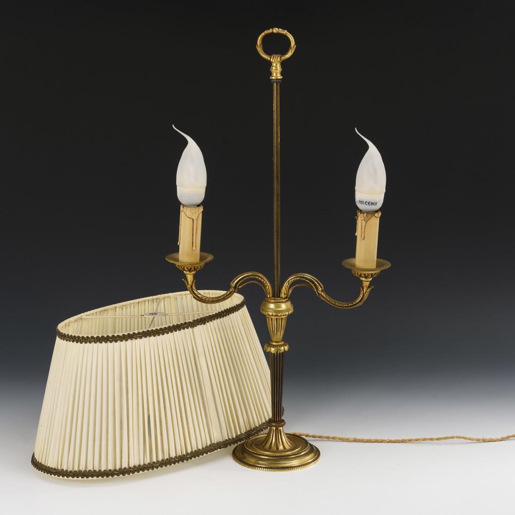 Bronze partly patinated, fabric shade. H 56 cm, W maximum 40 cm.