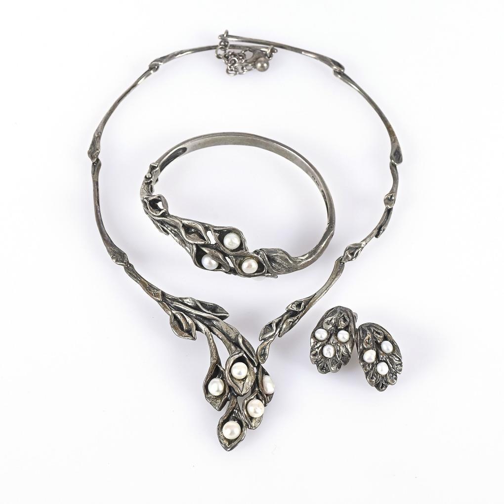 Silver 835 stamped. Hallmark: Pe. Necklace L 39-43,5 cm. Bangle Ø 6 cm. Ear clip 2,5 x 1,5 cm. 34,6/33,5/11,8 g.